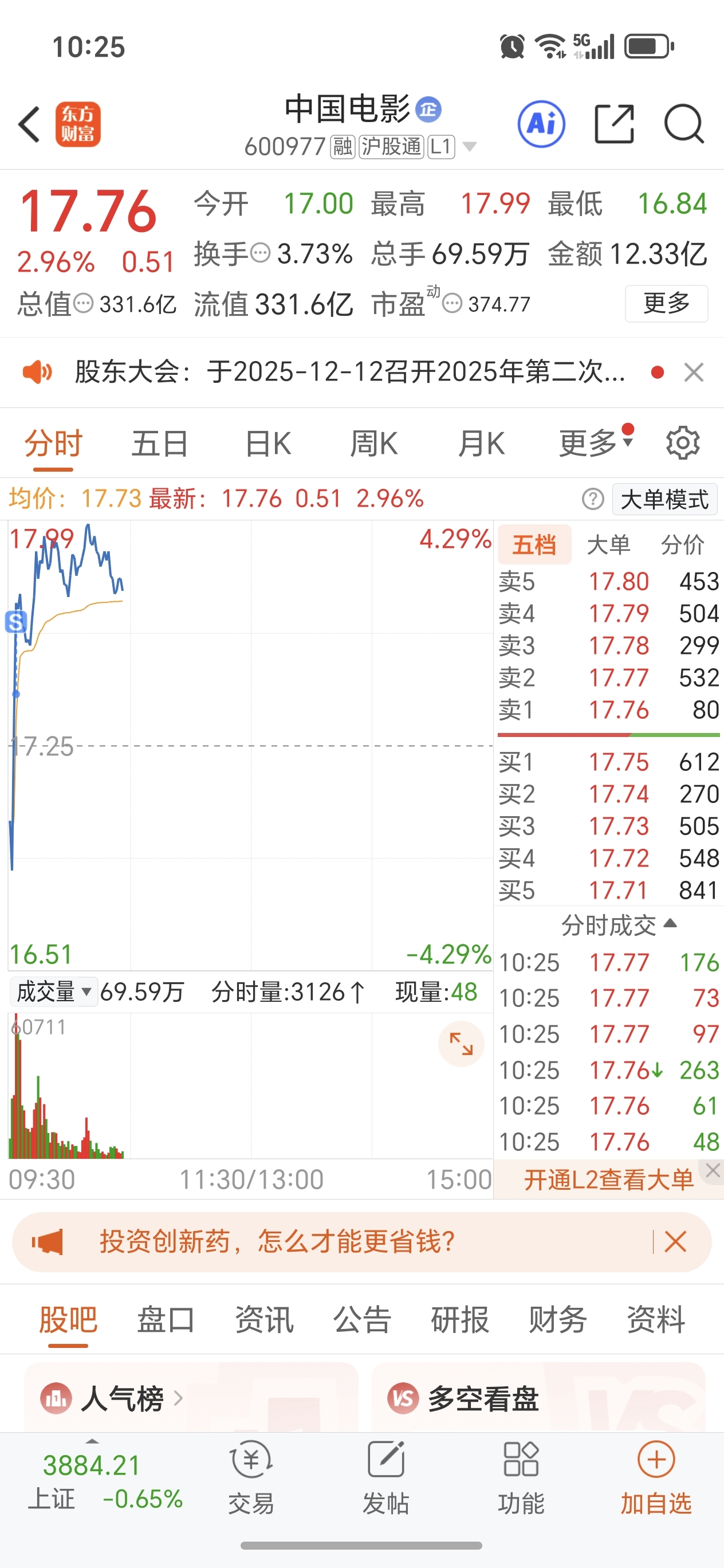 $中国电影(SH600977)$ 下来,干