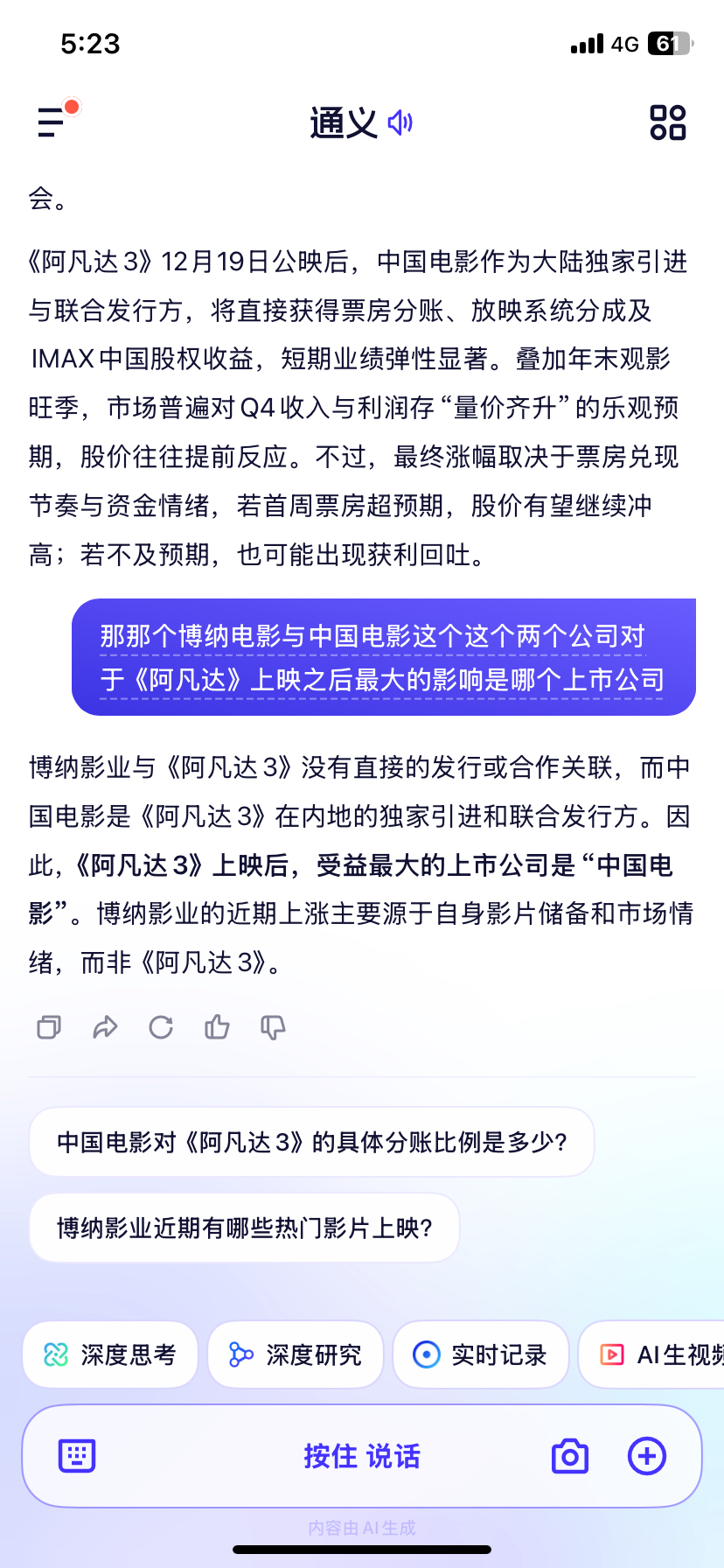$中国电影(SH600977)$ 通义 被人工智能欺骗了