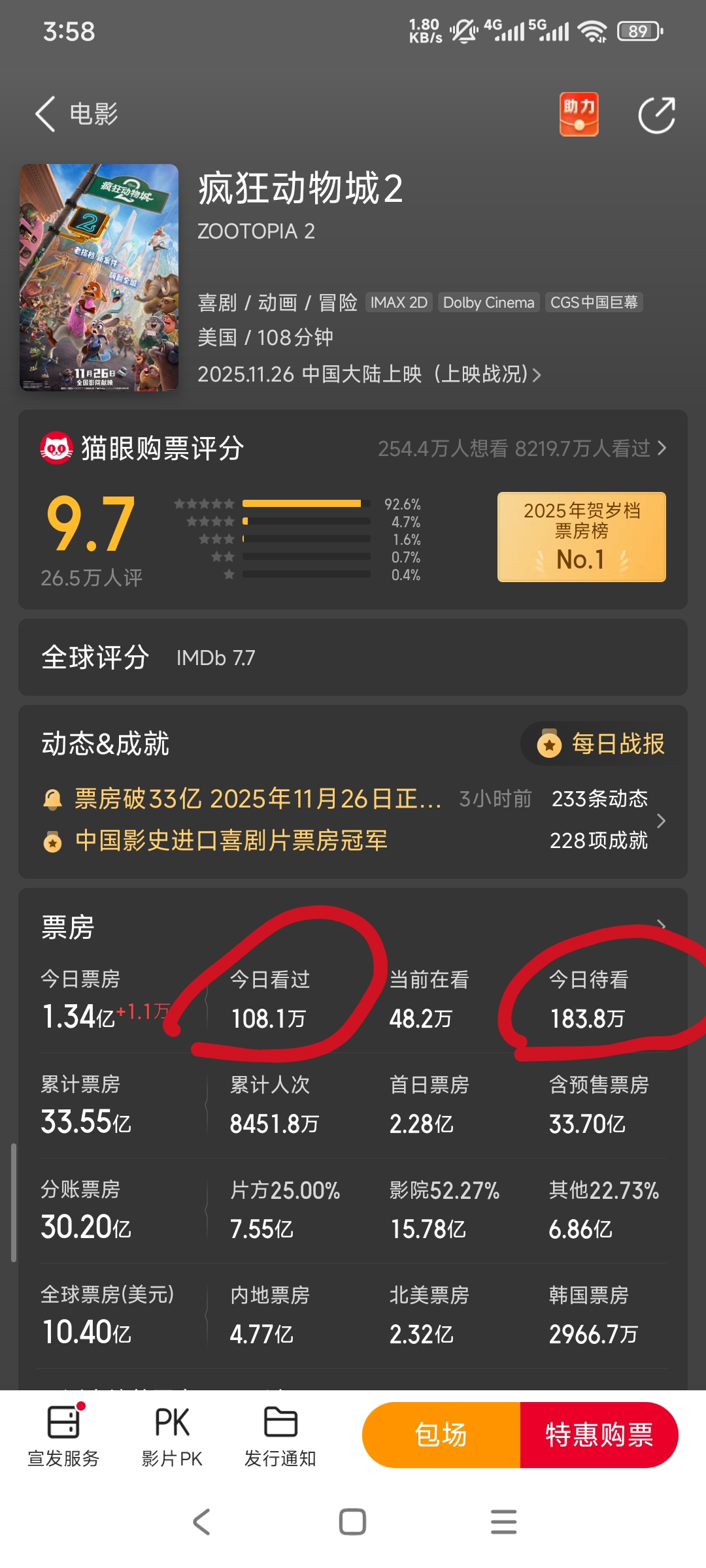 $中国电影(SH600977)$ $博纳影业(SZ001330)$ 这意思是晚上还有184万人还没看? 就是晚上还有1.8亿票房???