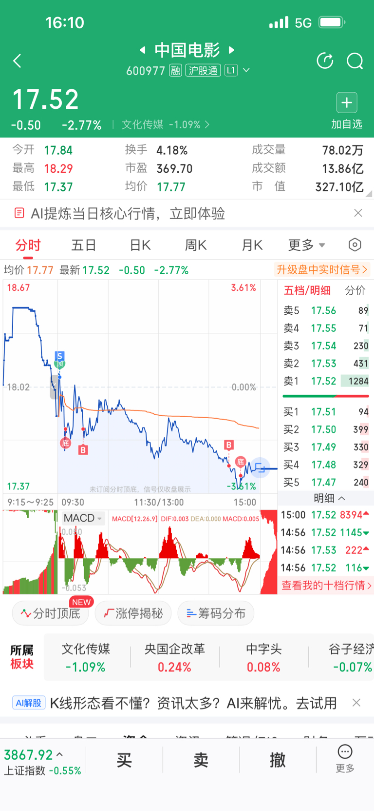 $中国电影(SH600977)$ 竞价跑了,盘中又接回来了