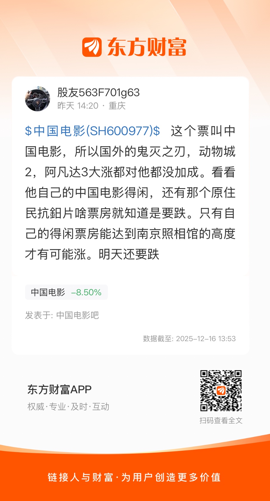 $中国电影(SH600977)$ 这个票叫中国电影,所以国外的鬼灭之刃,动物城2,阿凡达3大涨都对他都没加成。看看他自己的中国电影得闲,还有那个原住民抗鈤片啥票房就知道是要跌。只有自己的得闲票房能达到南京照相馆的高度才有可能涨。明天还要跌