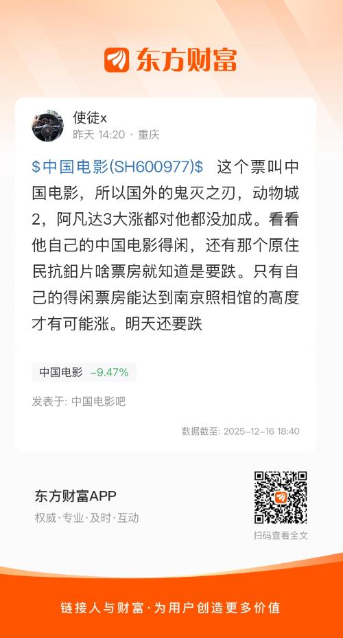 $中国电影(SH600977)$ 这个票叫中国电影,所以国外的鬼灭之刃,动物城2,阿凡达3大涨都对他都没加成。看看他自己的中国电影得闲,还有那个原住民抗鈤片啥票房就知道是要跌。只有自己的得闲票房能达到南京照相馆的高度才有可能涨。明天还要跌