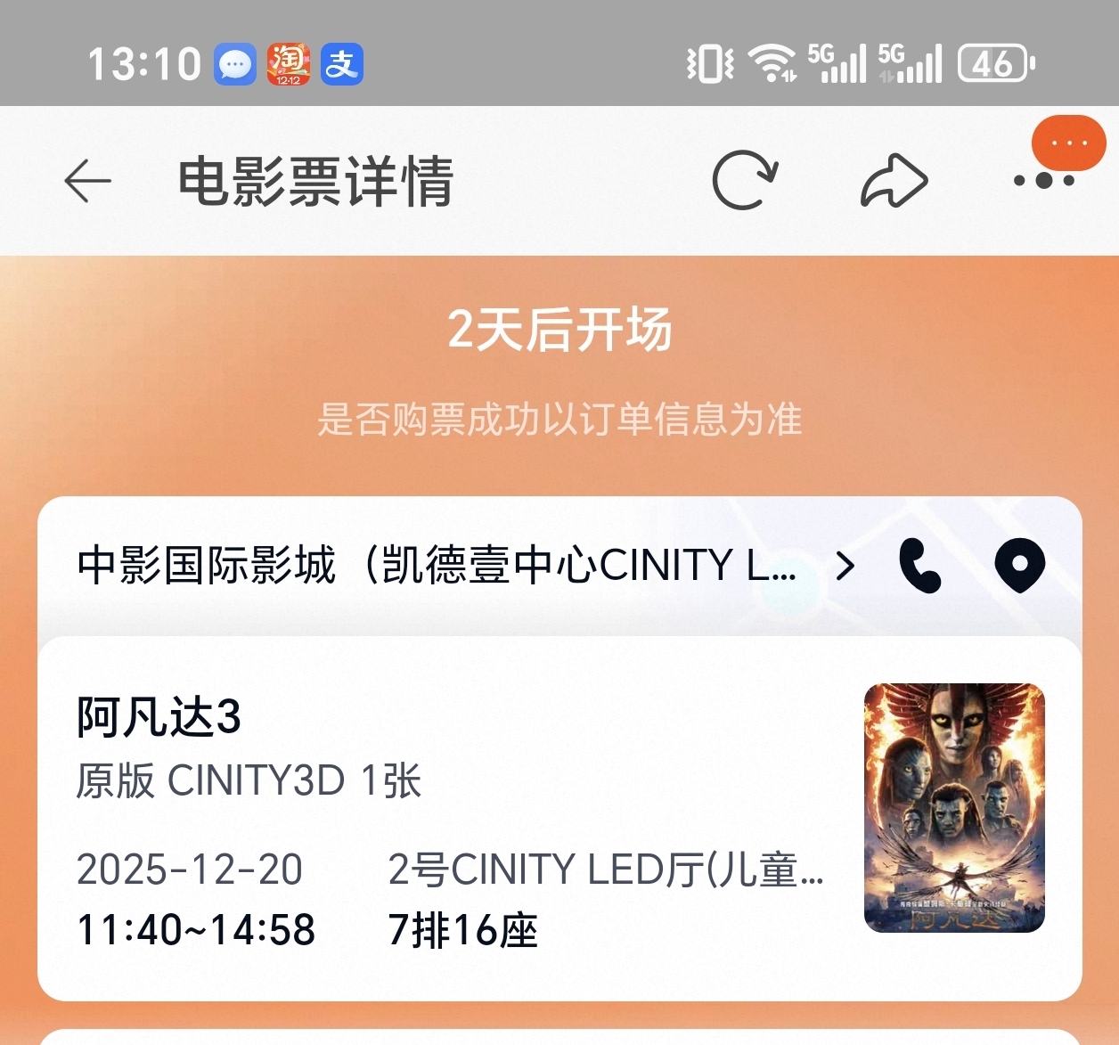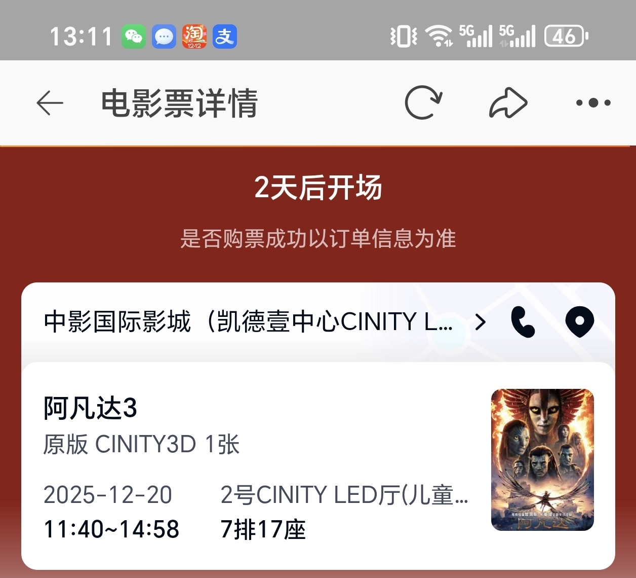 阿凡达3的CINITYLED影厅已经爆满了,只能买到周六的位置看了,期待