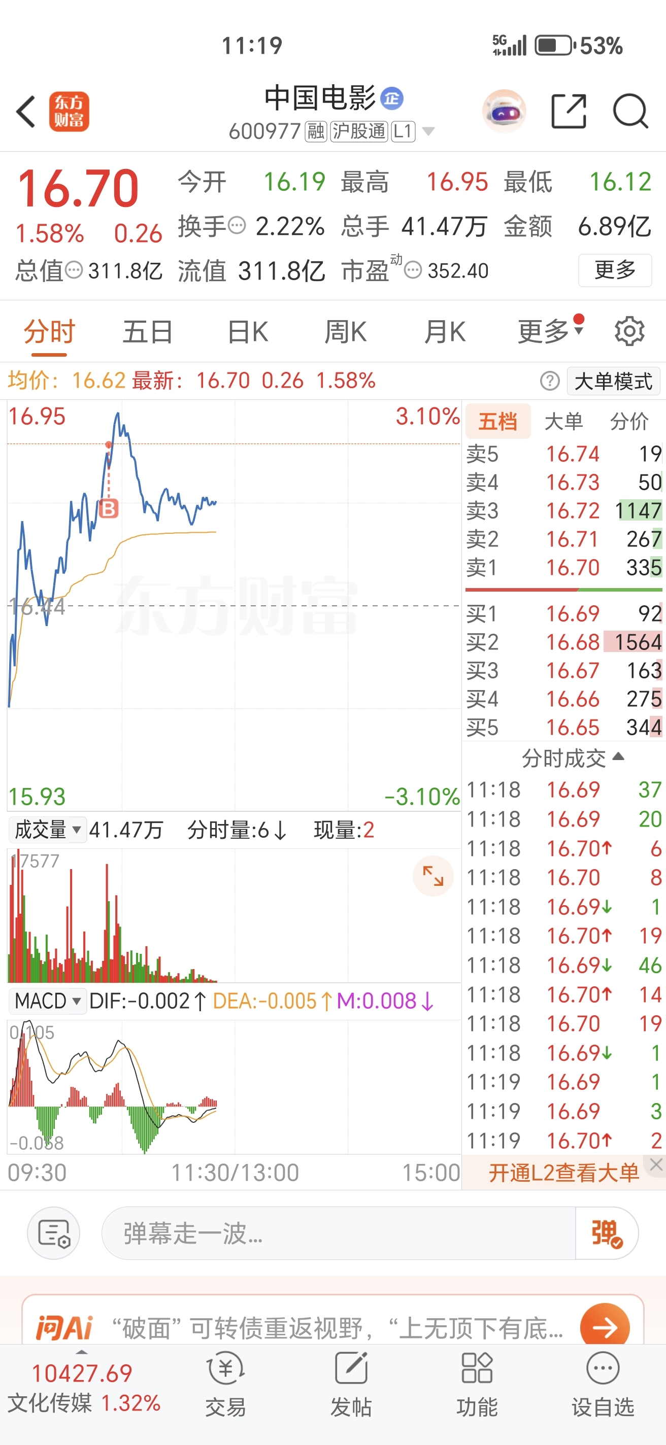 $中国电影(SH600977)$ 可能要做耐心资本了