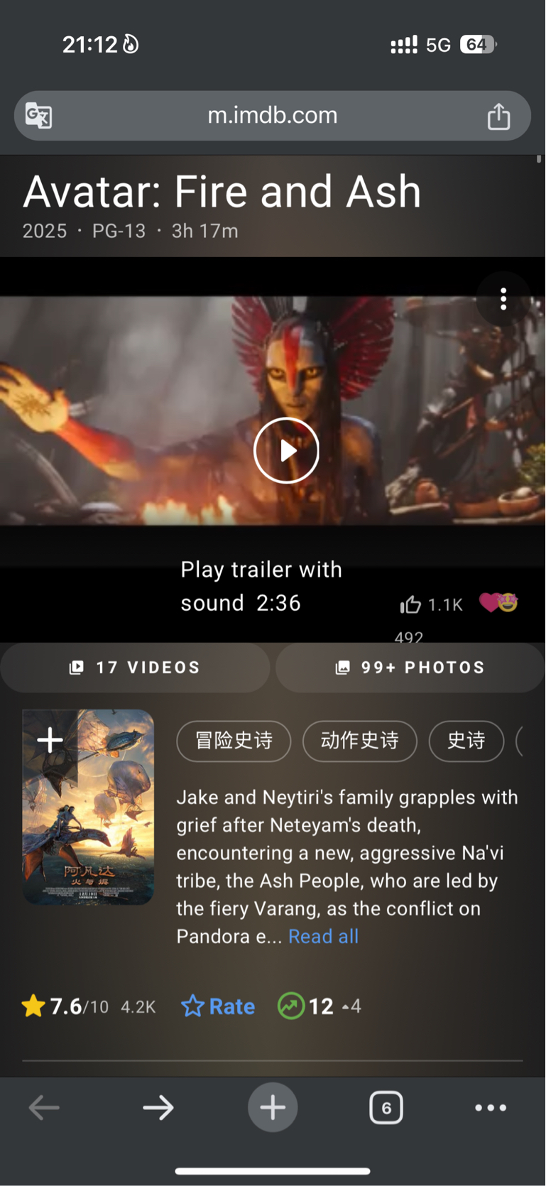 阿凡达3的imdb外网评分已经7.6了,还在继续上升,算是比较权威的评分了,阿凡