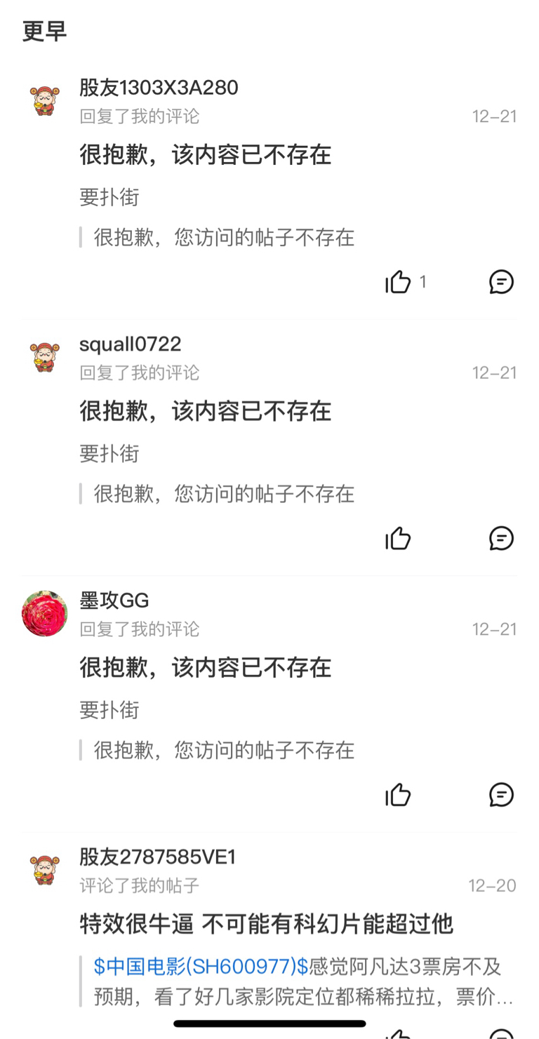 $中国电影(SH600977)$ 前天就说了阿凡达3票房不及预期,此股要暴跌,结果帖子被删了,我已经割肉清仓了,认亏,头铁的老铁继续拿