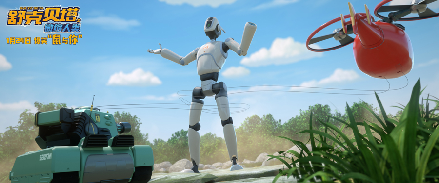 最新发布的定档海报呈现电影中的“微缩”设定,让观众最熟悉的黄金搭档以前所未有的冒险状态亮相——身形庞大的贝塔“骑着”绿色坦克欢快地向前冲锋,手里还小心翼翼抱着伙伴的红色直升机;而迷你体型的舒克则藏身在贝塔头顶,宛如一位从容的小指挥官,默契地呼应同伴。这一大一小、一陆一空的组合,构成了银幕上生动可爱的“立体作战小队”。在他们身后,各方势力追逐而来,让人忍不住好奇这场“大小反转”的对决究竟会如何展开。