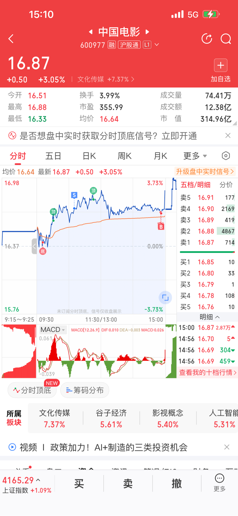 $中国电影(SH600977)$ 尾盘又让我多赚两毛?
