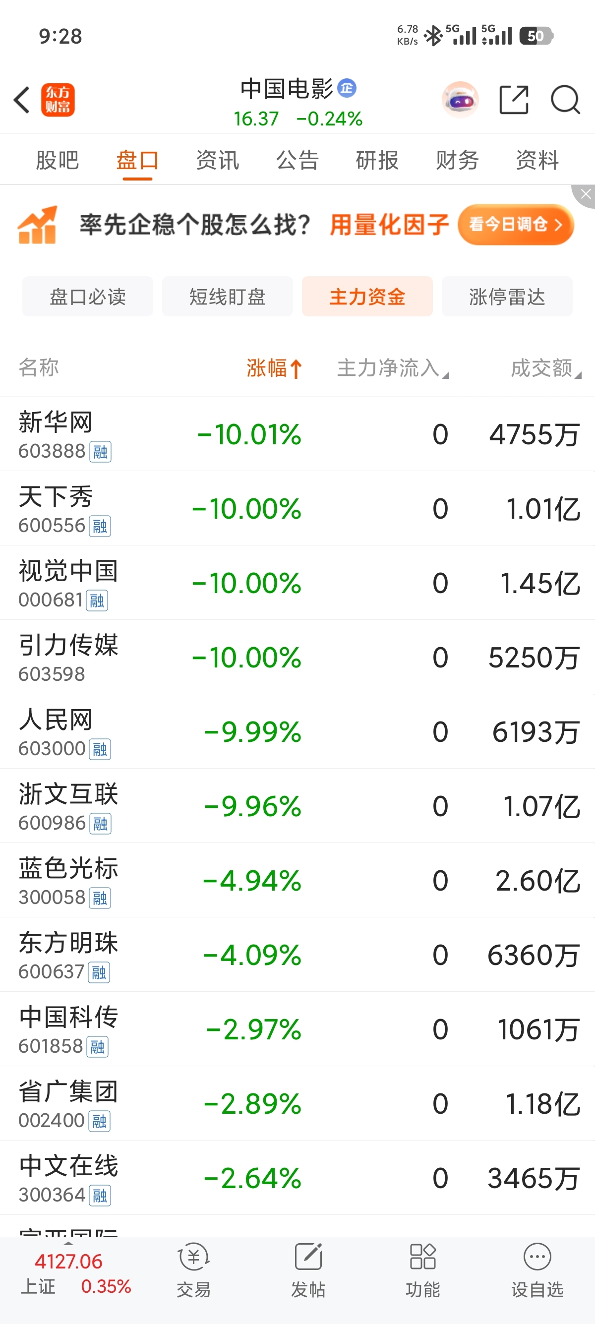 $中国电影(SH600977)$ 前期涨停的传媒都跌停,今天也该资金流向你了吧
