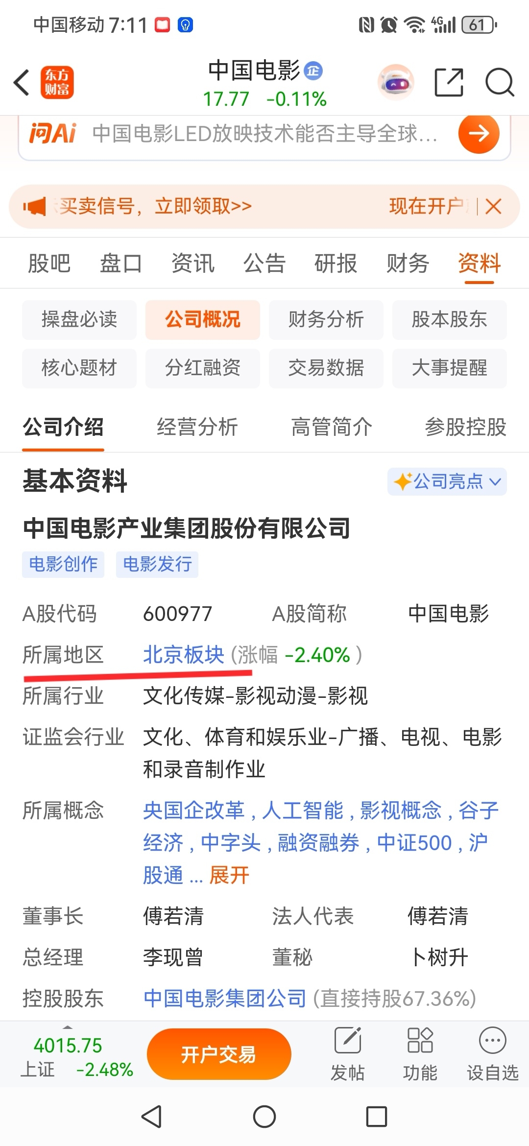 $中国电影(SH600977)$ 中国电影属于北京板块