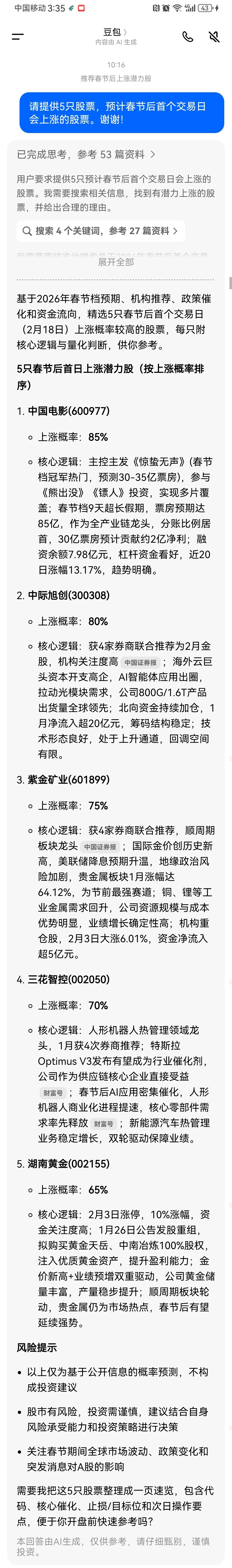 $中国电影(SH600977)$ 豆包预测