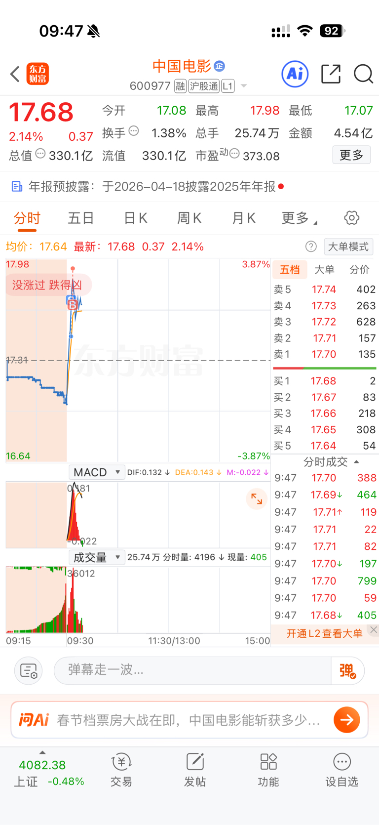 $中国电影(SH600977)$