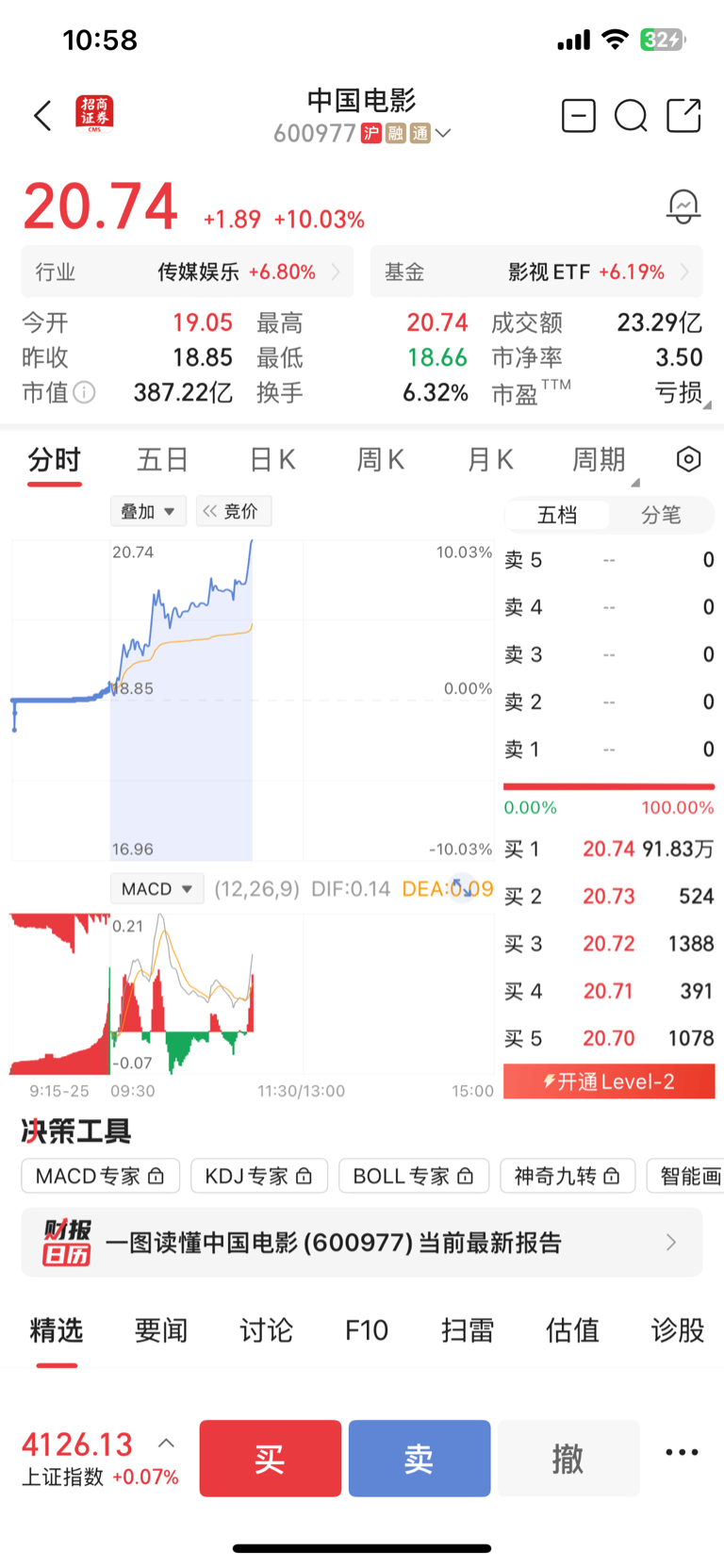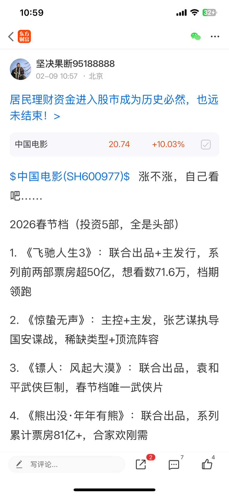 $中国电影(SH600977)$ 别说我没有提醒你们,17块就已经潜伏了,一切都在预期之中,昨天就说了发了2个帖子都说这家伙是投资春节档最多的公司怎么样,不负众望,兄弟们……今天终于涨停了哈哈爱你们……