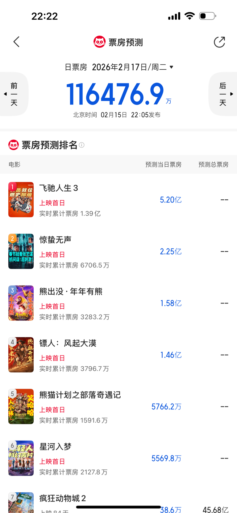 $中国电影(SH600977)$ $光线传媒(SZ300251)$ $博纳影业(SZ001330)$ 首日票房目前的预测才5.2个亿?如果真是5.2个亿说实话最多3个板,我敢说等到17号远超5.2亿.并且明天预售结束之后直接就超过6亿预测了,因为明天当天的预售随便都过亿了.