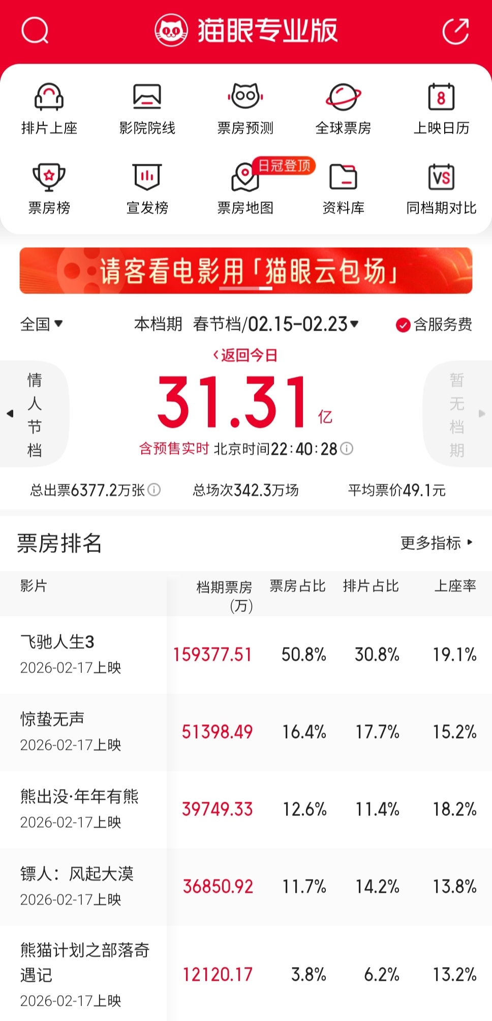 年前有一天大跌,资讯说,春节档预计45个亿。看来明后天就能超过50个亿了。能不能
