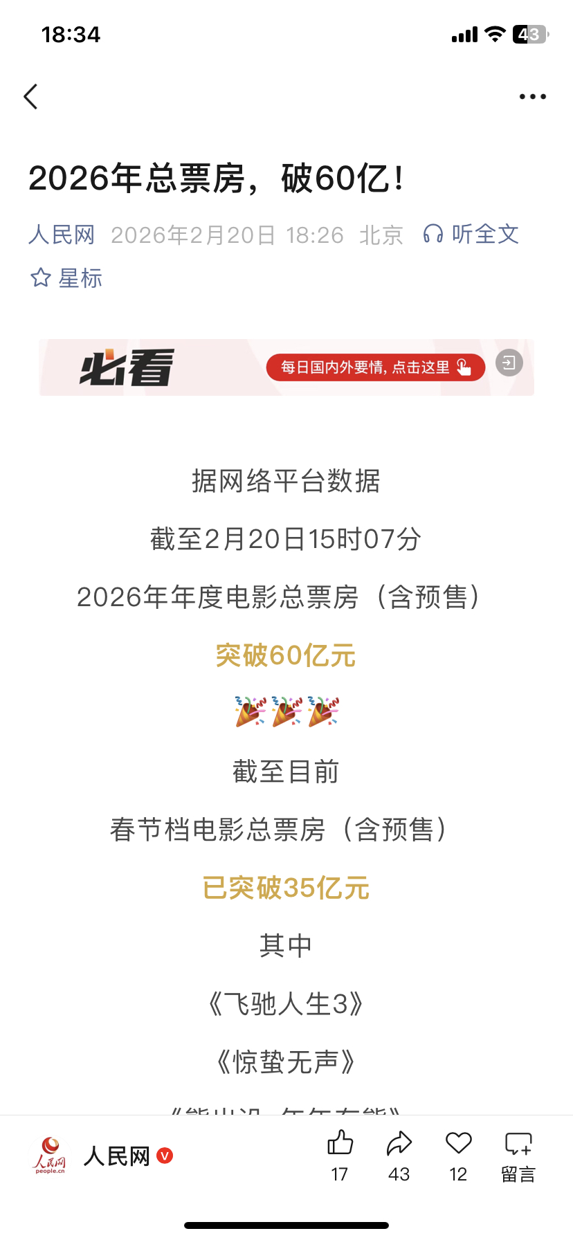 $中国电影(SH600977)$ 炒股你要领会央媒的意思,为什么总提总票房,今年不是去年靠一个电影的时代,今年主要搞总票房,你买的是横店或者博纳,你可能会瑟瑟发抖,你持有的是中影怕个毛线啊,中影春节档投资的总票房依然有60亿预期,中影还有院线分成。稳的很。