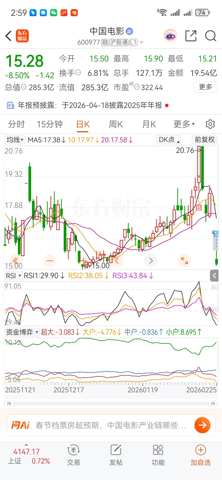 $中国电影(SH600977)$ 明天消户了,哎,玩不了,来送钱