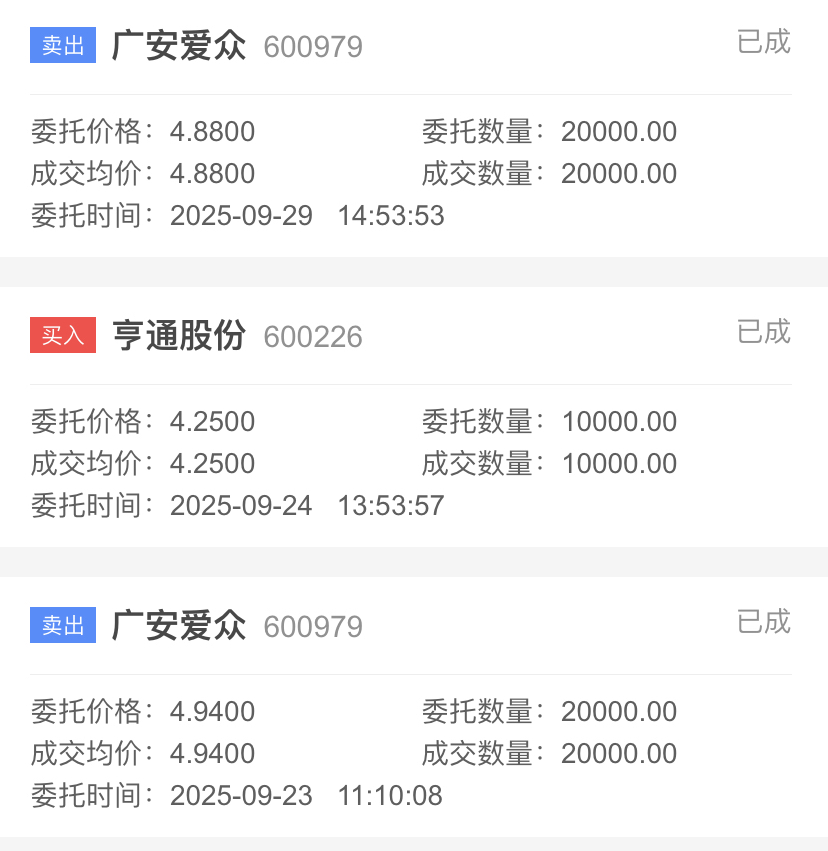 9月23日、29日广安爱众离场,总亏400元,转身4.25加仓(前仓3.7)亨通