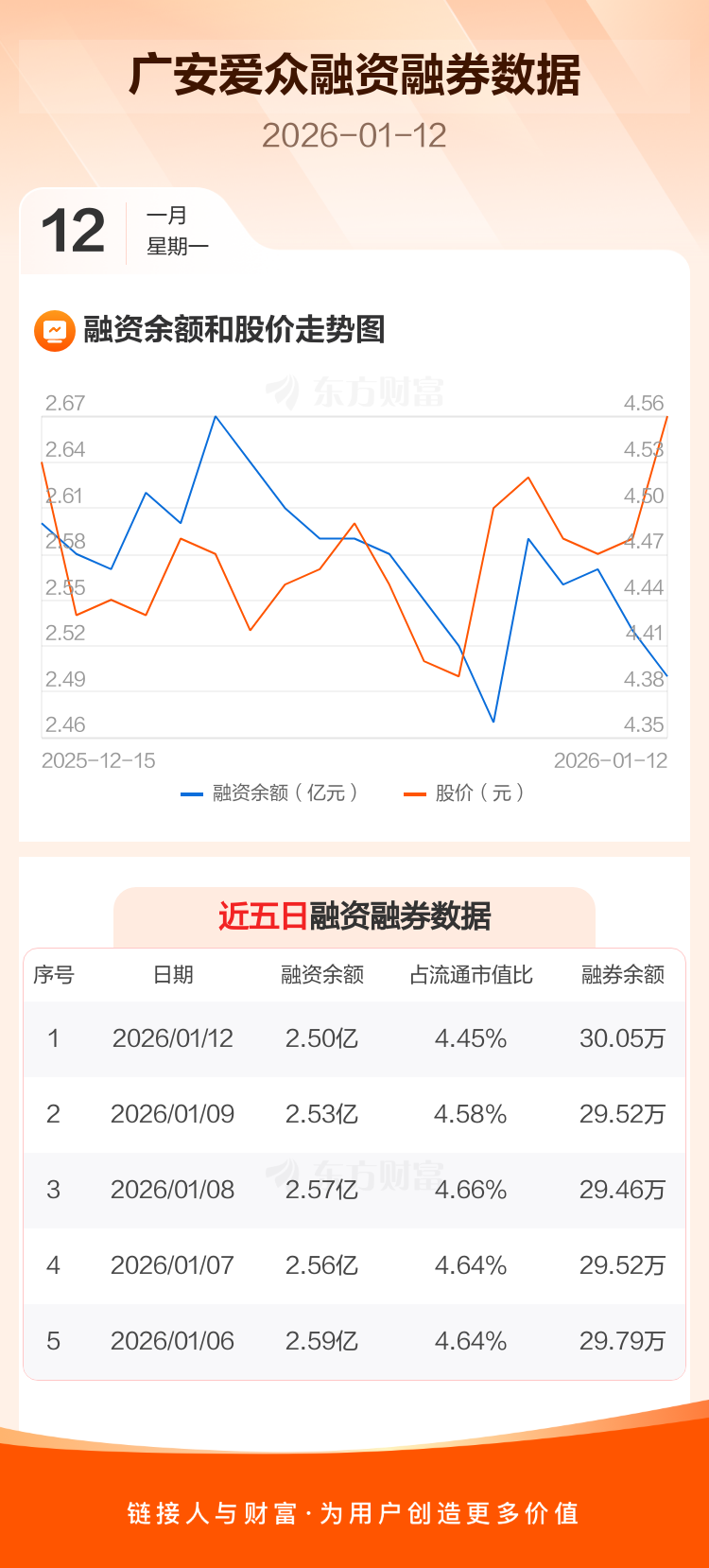 交易所最新数据显示,广安爱众于2026年1月12日获融资买入1603.85万元,融资偿还1886.15万元,当日融资净偿还282.3万元。目前,该股融资余额2.50亿,占流通市值比例为4.45%。