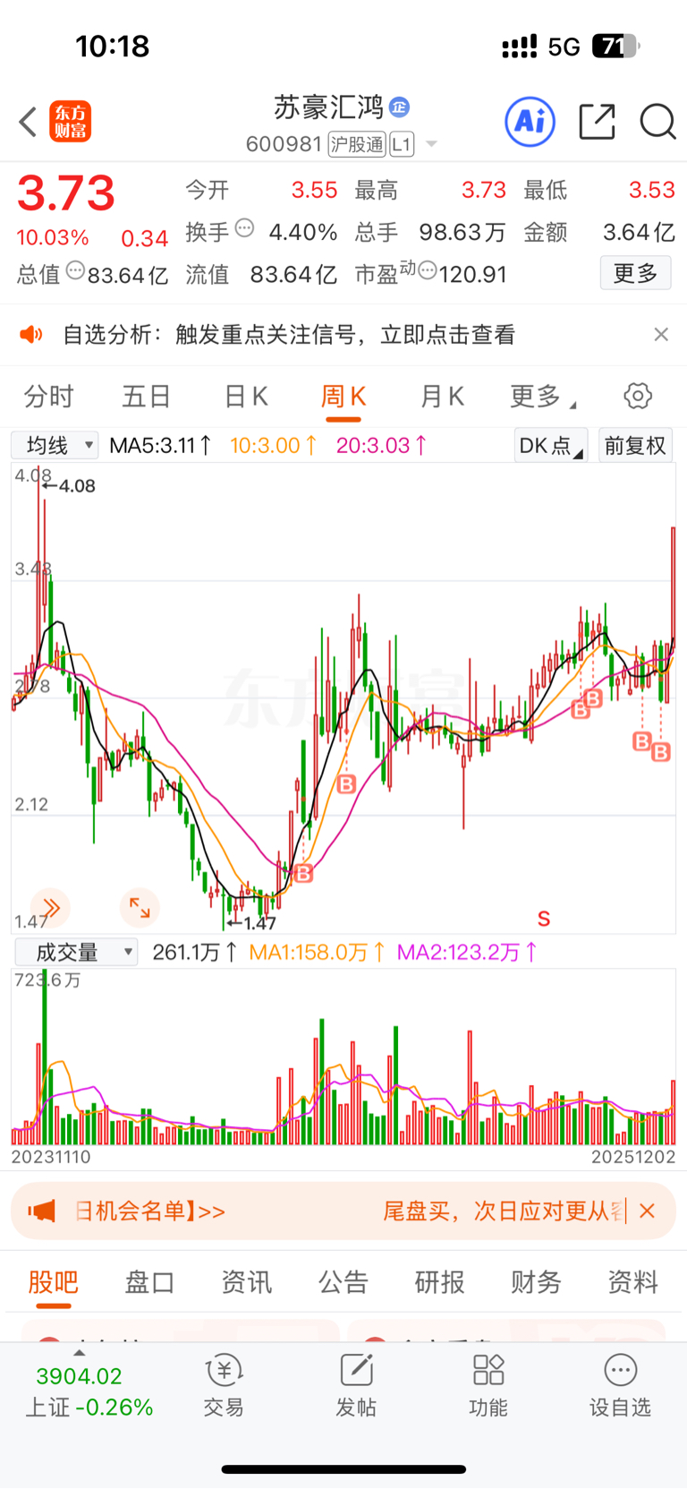$苏豪汇鸿(SH600981)$ 408是个大压力位,拿了这票近两年,几乎没有连板的命,这次三板已经超预期了,先走个半仓,剩下的就看明天了