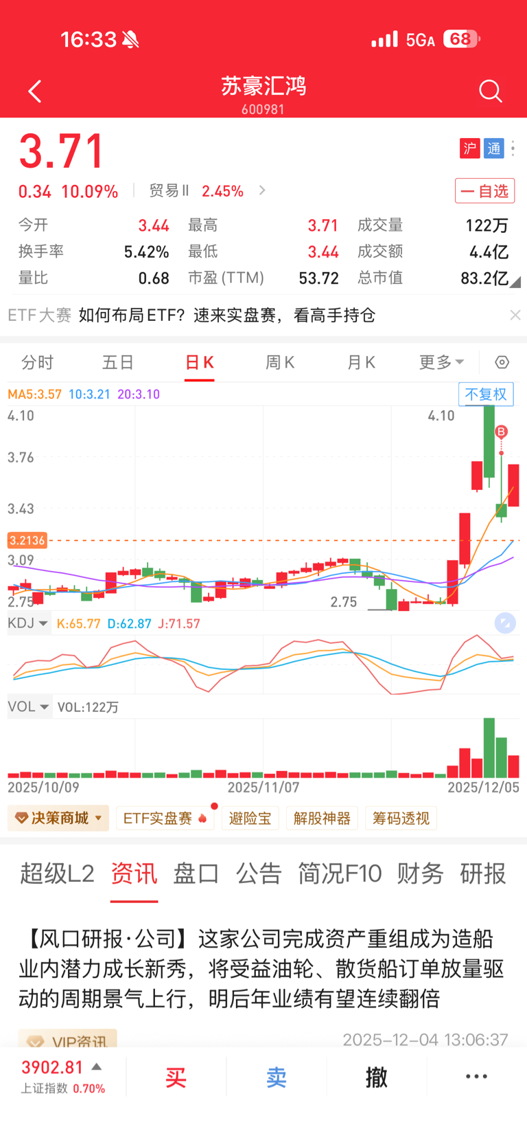 $苏豪汇鸿(SH600981)$ 昨天3.4进来的,周一走怎么样