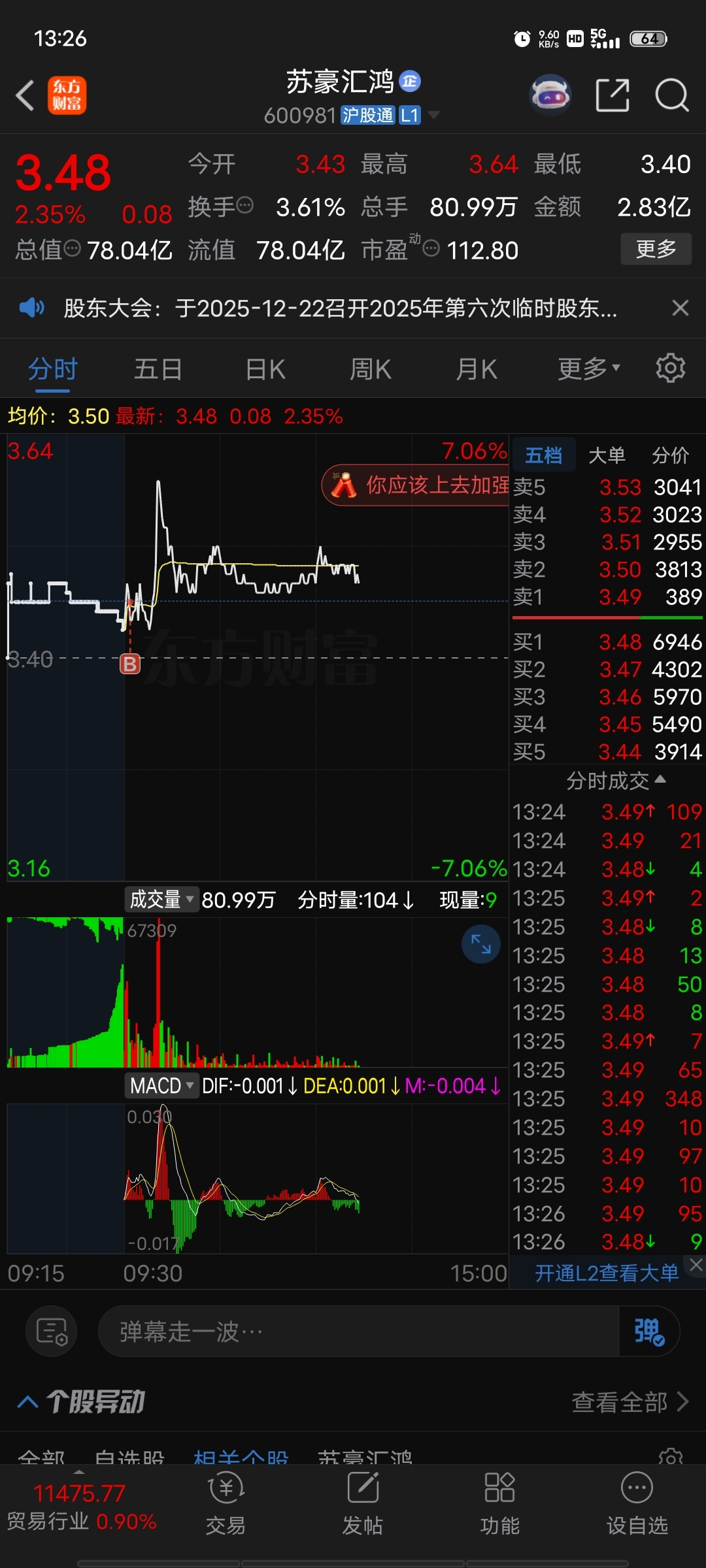 $苏豪汇鸿(SH600981)$ 你该上去!加强一下消费的强度!