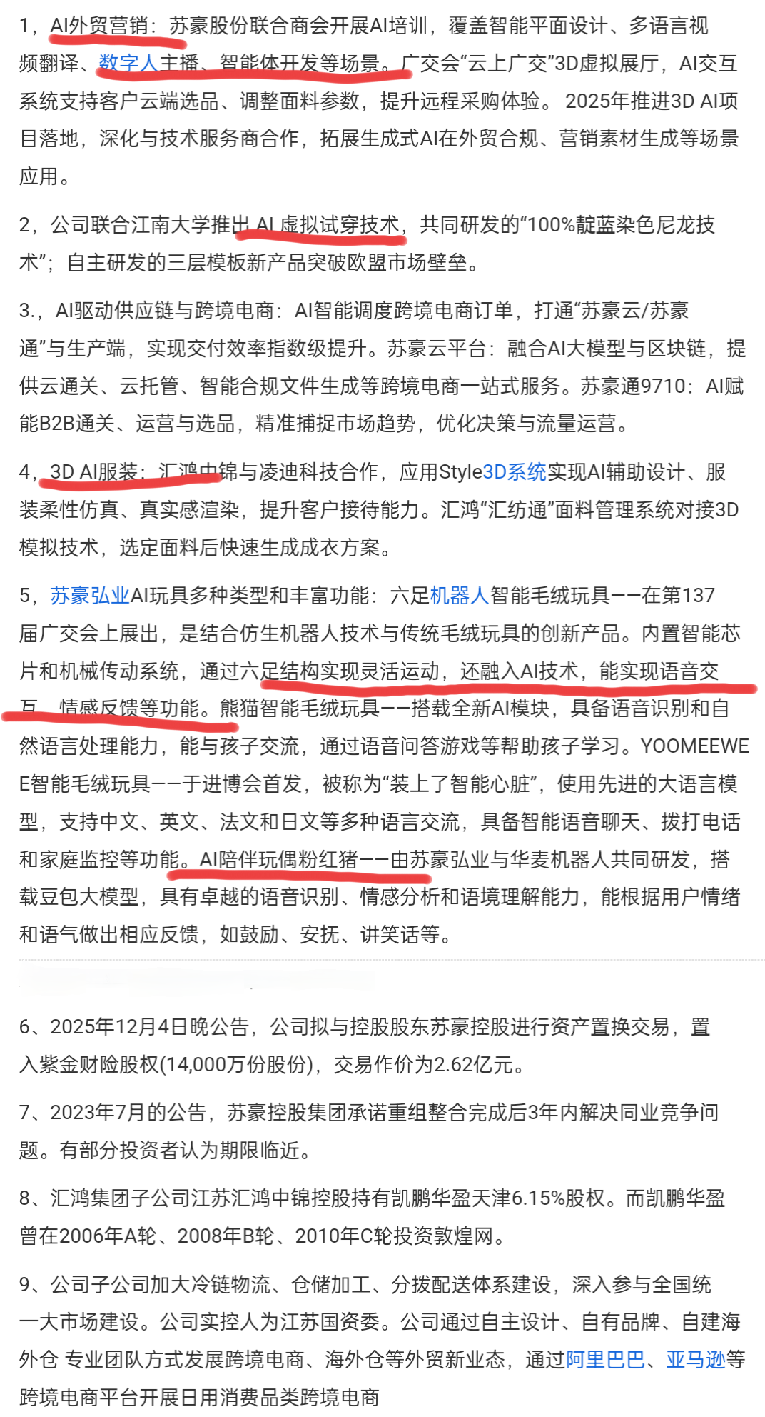 苏豪汇鸿:全球AI外贸营销龙头+AI应用+AI虚拟试穿+AI玩具+拟资产置换+敦煌网+江苏国资+跨境电商。