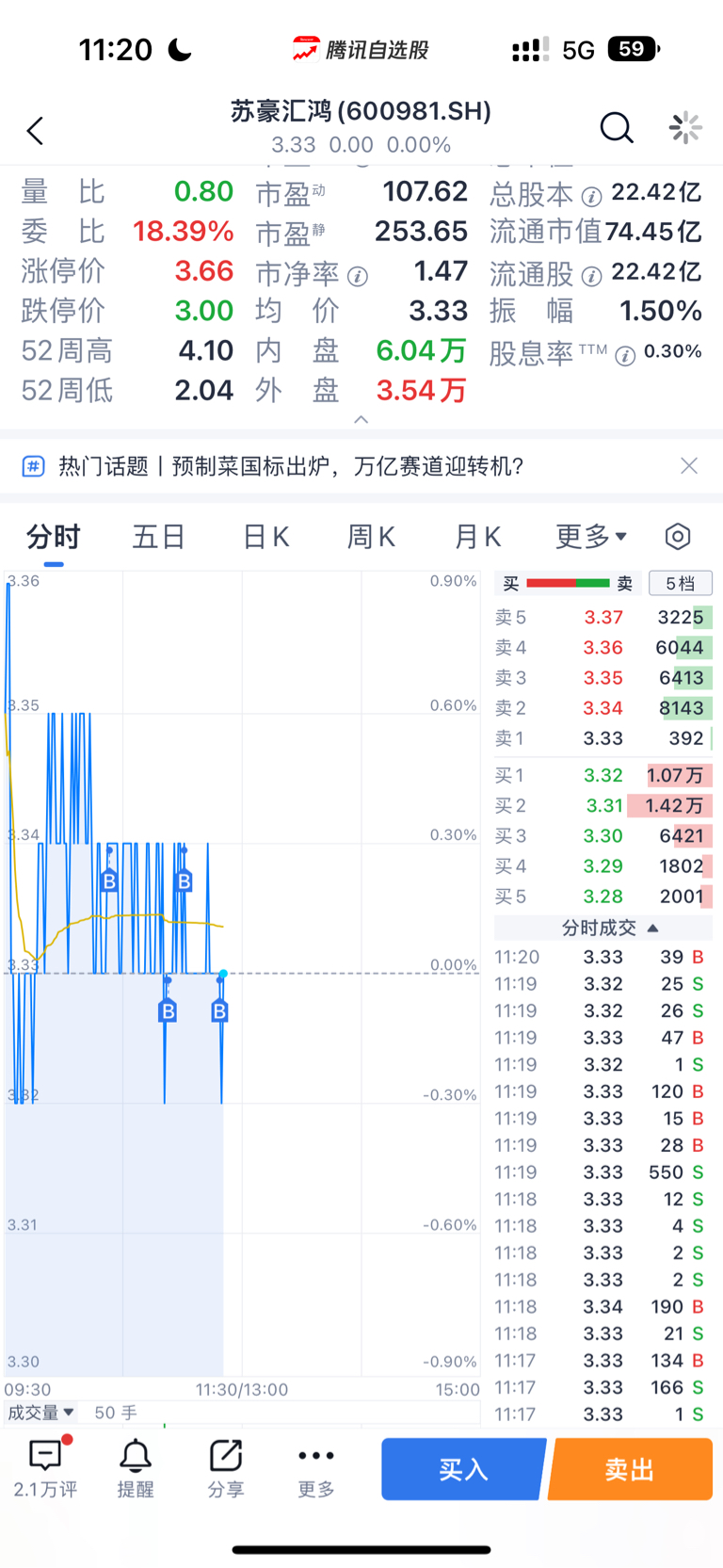 $苏豪汇鸿(SH600981)$ 求你来个大压单好不好3.33。砸破3.2也行。我买