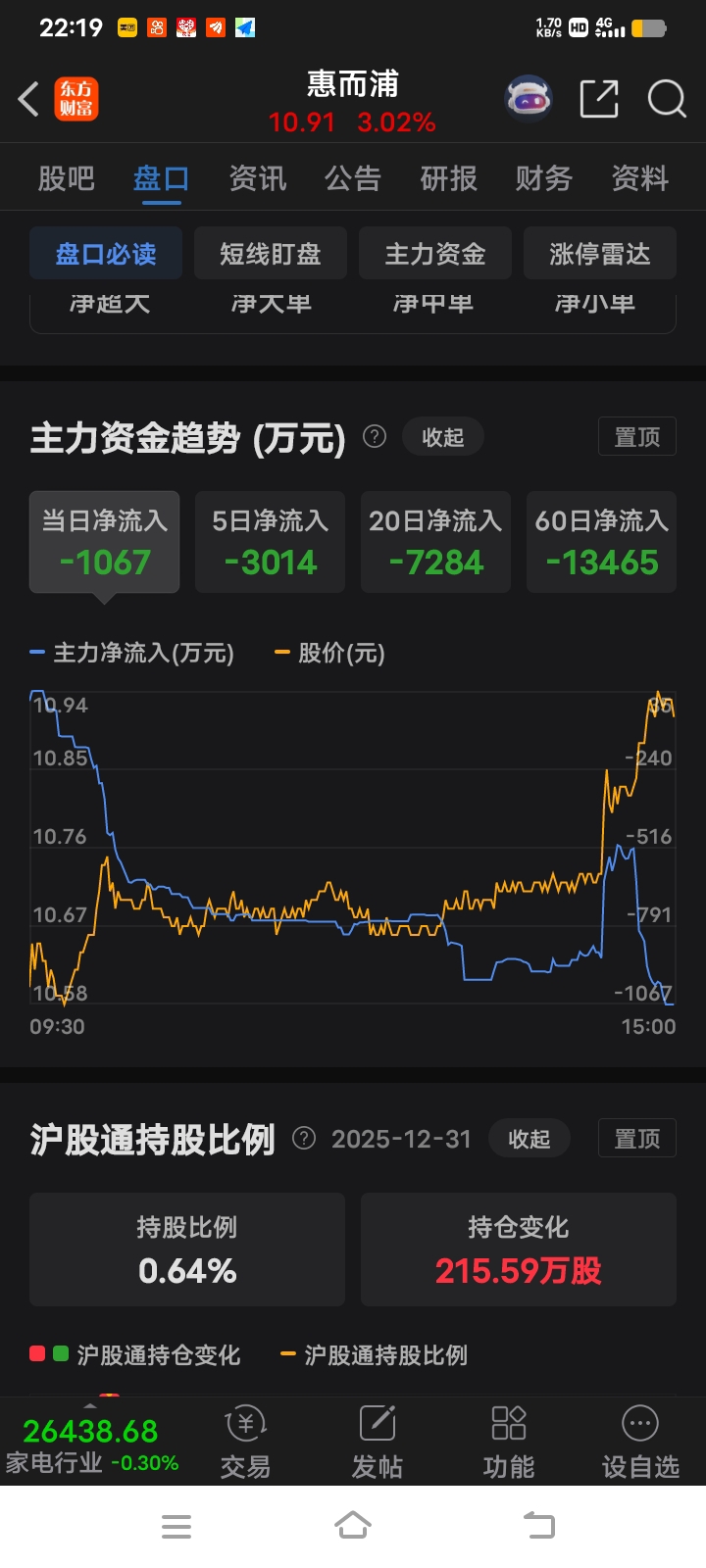 下午2:45后惠而浦资金是全天流出最多的时候。