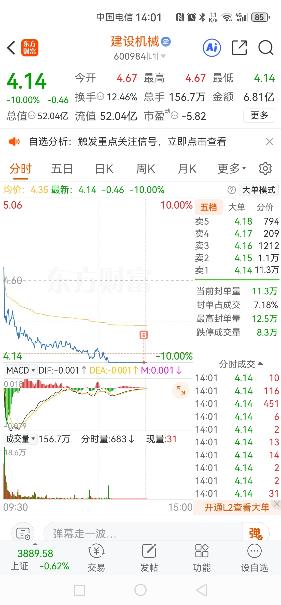 $建设机械(SH600984)$ 至少今天不会再跌了!