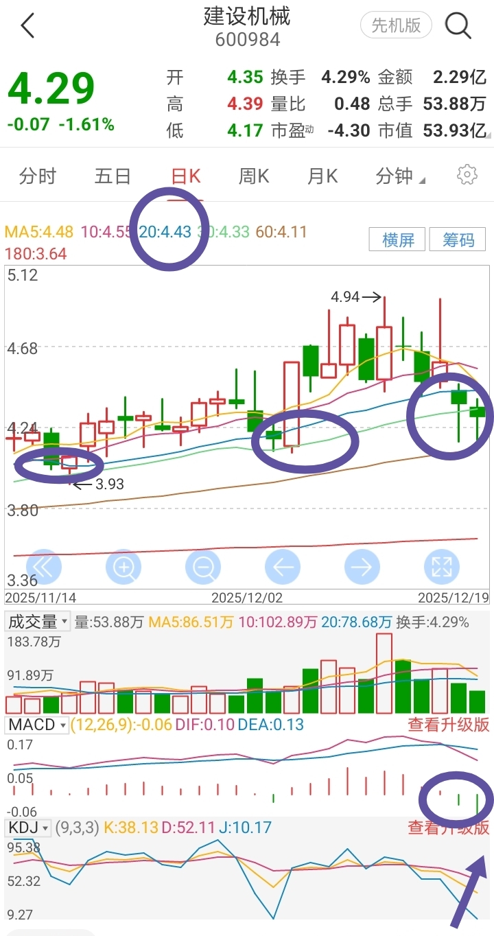 $建设机械(SH600984)$ 一哥观点:股价中长期趋势线20日线,如果股价三天无法站上20日均线4.43元,那么大概率就要重新划分趋势了。周一,收盘前不涨回来,建设机械,,,,休已,,,,板块没有炒作性,主力上周诱多涨停回落,全天冲进需求散户,昨天又向下打压收起,主力筹码到底有多少,我们无从所知,只有看趋势,最后,周一20线4.43拿不回来,趋势就改变向下运行了。