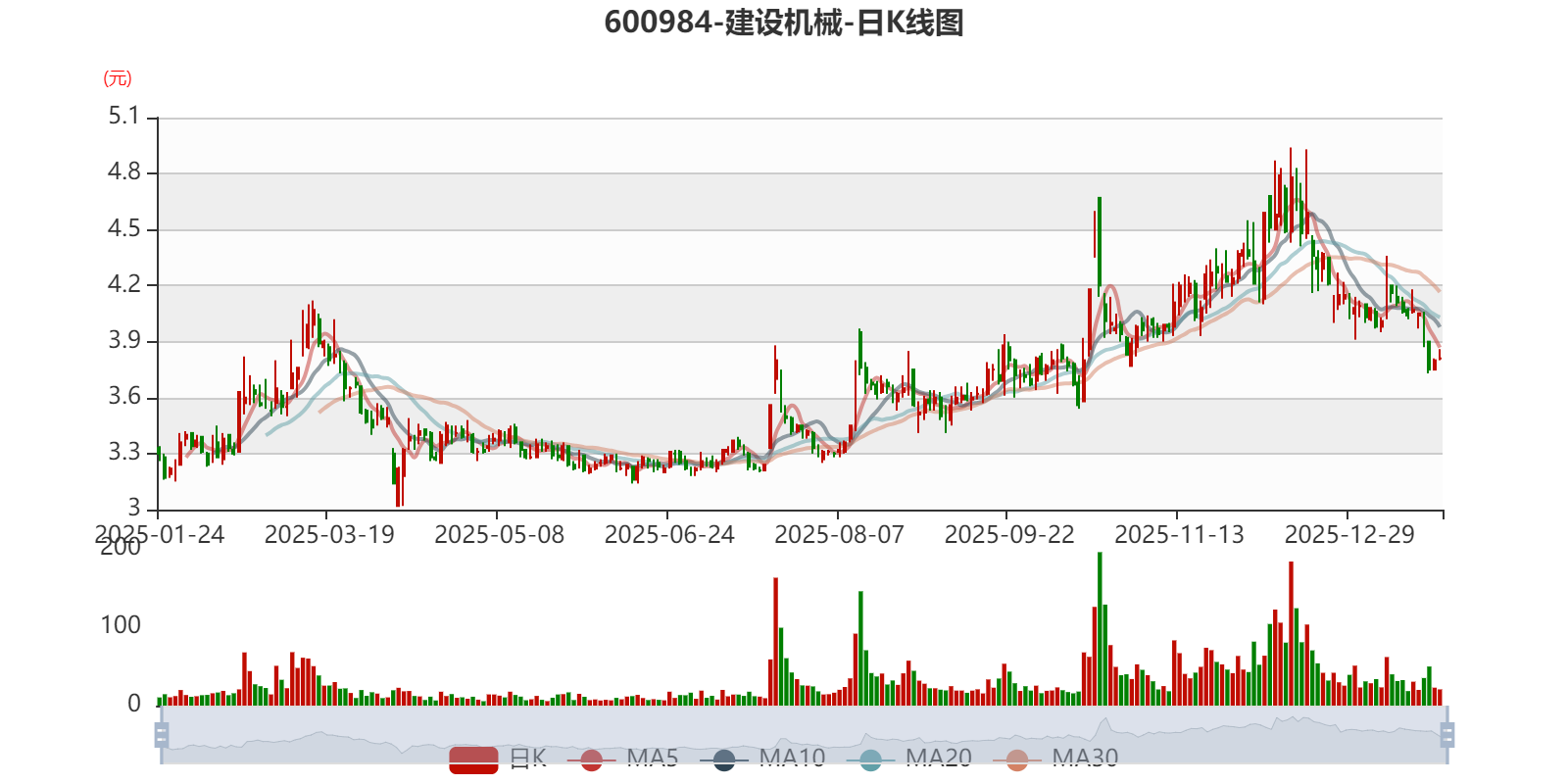中证智能财讯建设机械(600984)1月23日晚间披露2025年度业绩预告,预计2025年归母净利润亏损20.72亿元,上年同期亏损9.88亿元;扣非净利润亏损20.82亿元,上年同期亏损10.01亿元。以1月23日收盘价计算,建设机械目前市盈率(TTM)约为-2.31倍,市净率(LF)约1.44倍,市销率(TTM)约1.9倍。