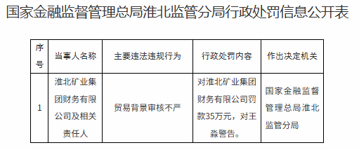淮北矿业集团财务有限公司因贸易背景审核不严被国家金融监督管理总局淮北监管分局罚款35万元。相关责任人王淼,受到警告处罚。