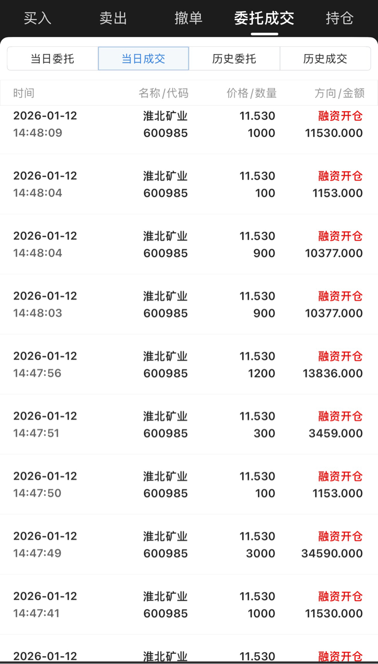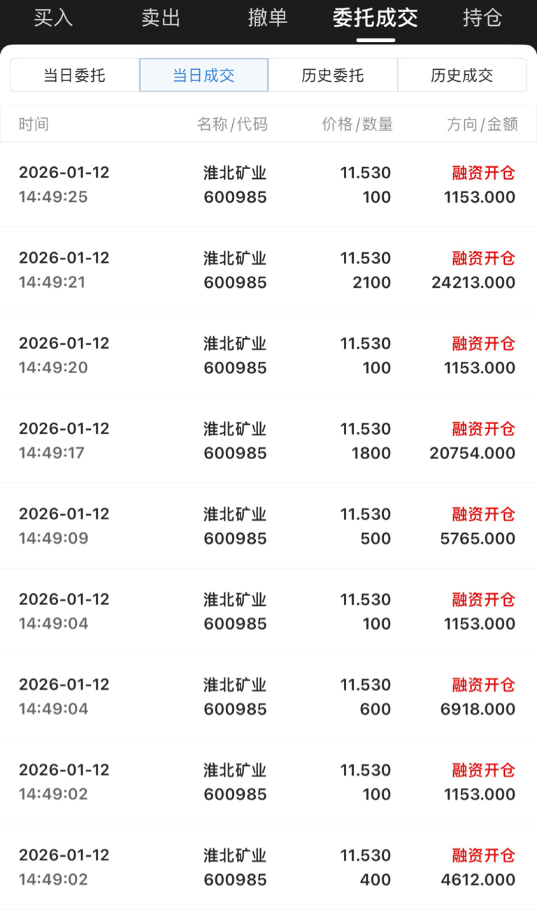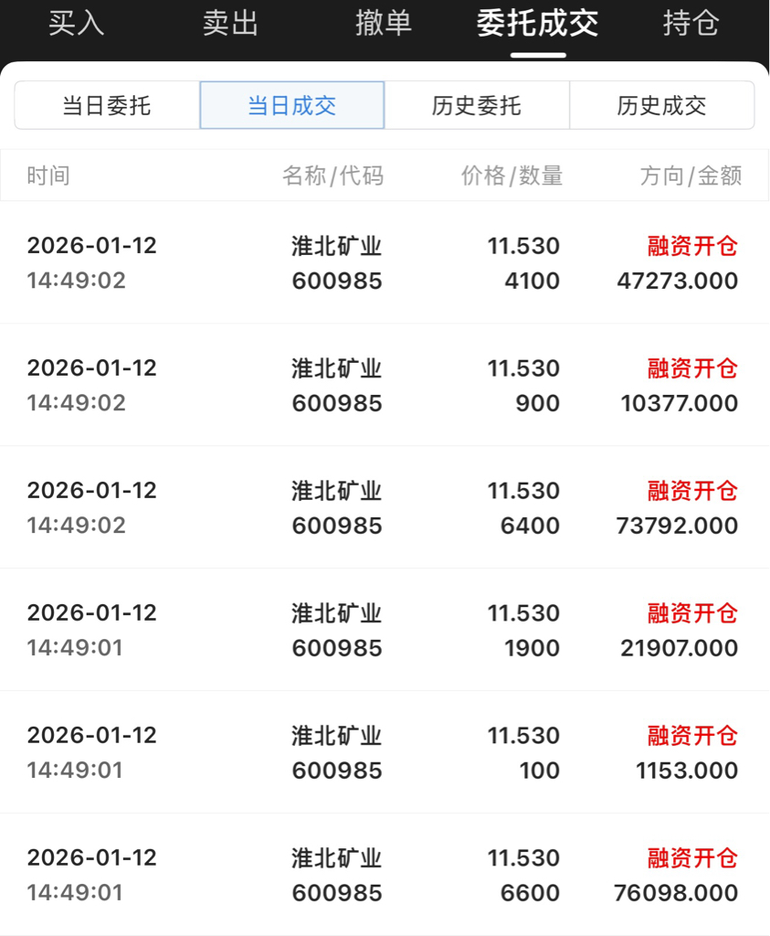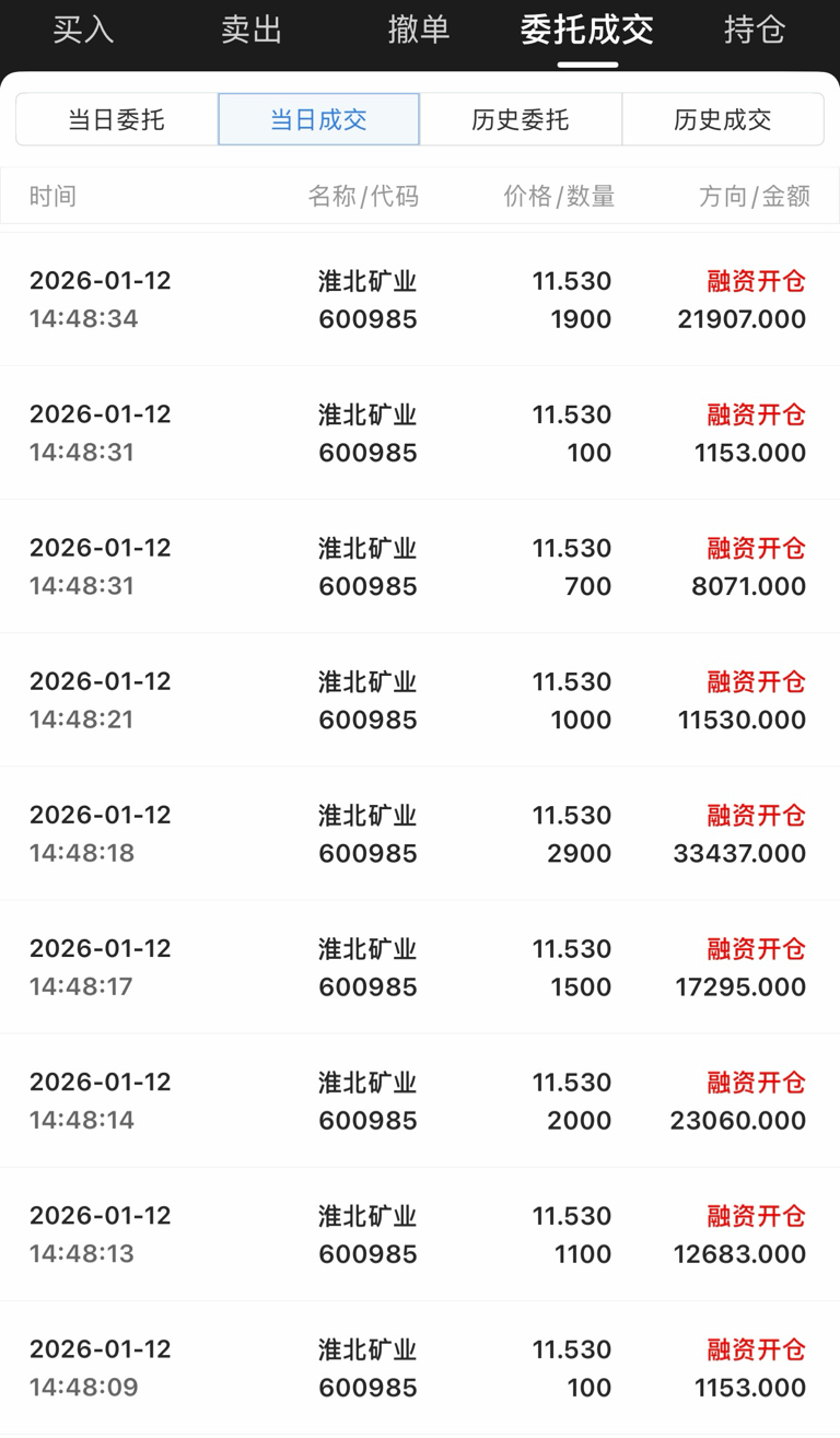 今日入局淮北矿业,融了500个w,心不贪,挣几毛钱就行,希望这周能在淮北这里喝口