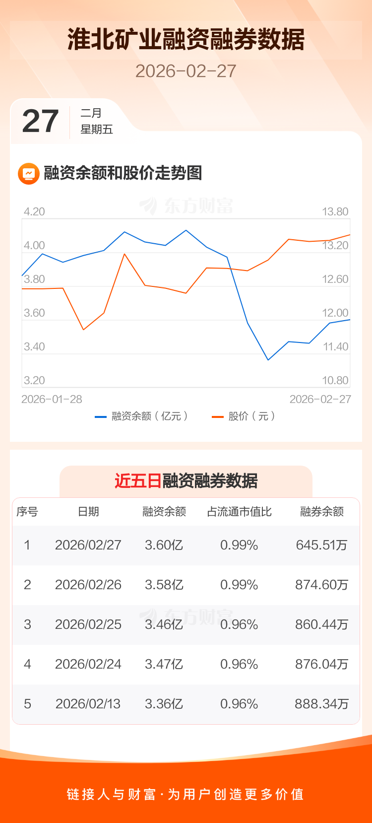 交易所最新数据显示,淮北矿业于2026年2月27日获融资买入2880.63万元,融资偿还2689.88万元,当日融资净买入190.75万元。目前,该股融资余额3.60亿,占流通市值比例为0.99%。