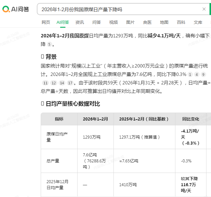 随着资源劣化与开采深度增加,我国原煤产量开始下降,据国家统计局数据,2026年1-2月份统计的原煤日均产量比去年同期下降4.1万吨/天,其中焦煤还面临原煤到精煤的洗出率下降问题(由2020年的39.9%降至2024年的35.5%),需补充大量进口煤,但近期石油、天然气涨价兼缺货导致全球疯狂抢煤,由以前的进口煤价压制国内煤价反转为进口煤价“逼涨”国内煤价。