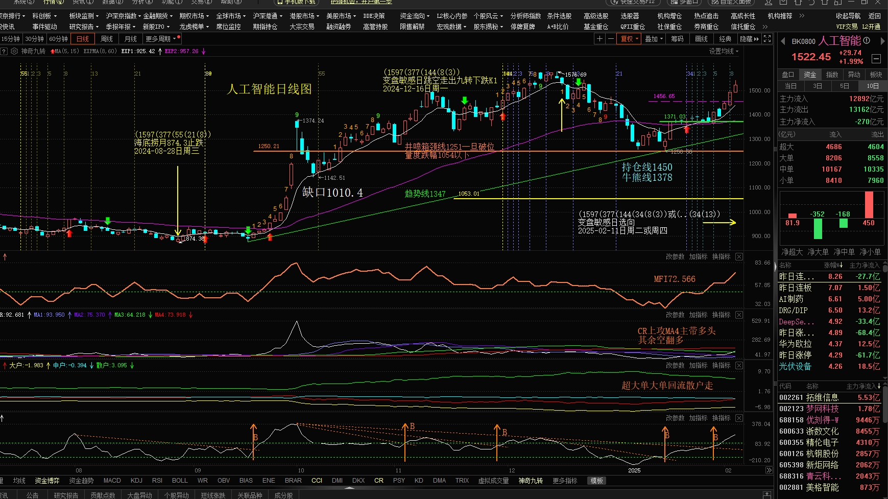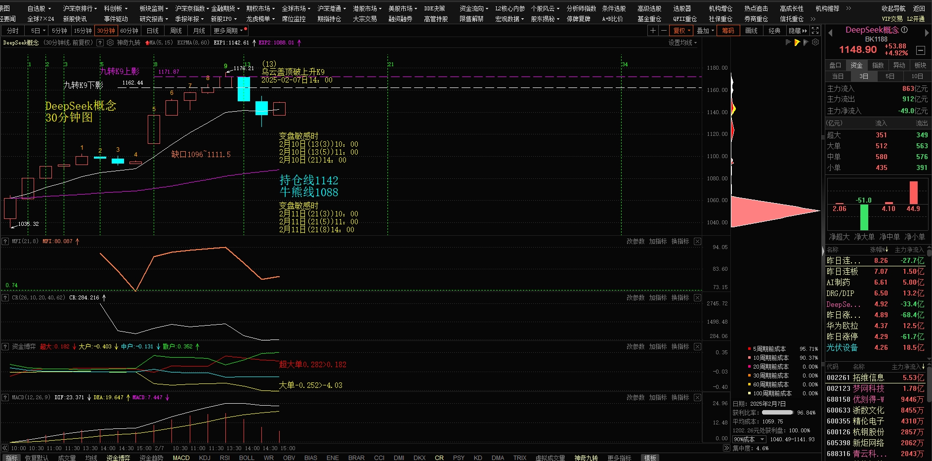 2月7日13:30创新高,14:00构筑乌云盖顶,正是30分钟的数列(13)起作用,今天DeepSeek选向时间和明天选向时间都已列出,近两天,我收集的50只DeepSeek有关联股都升势凌励,上周五涨跌比37:13,许多上市公司都发出风险预警,近两天,DeepSeek板块主力净流出-49亿。