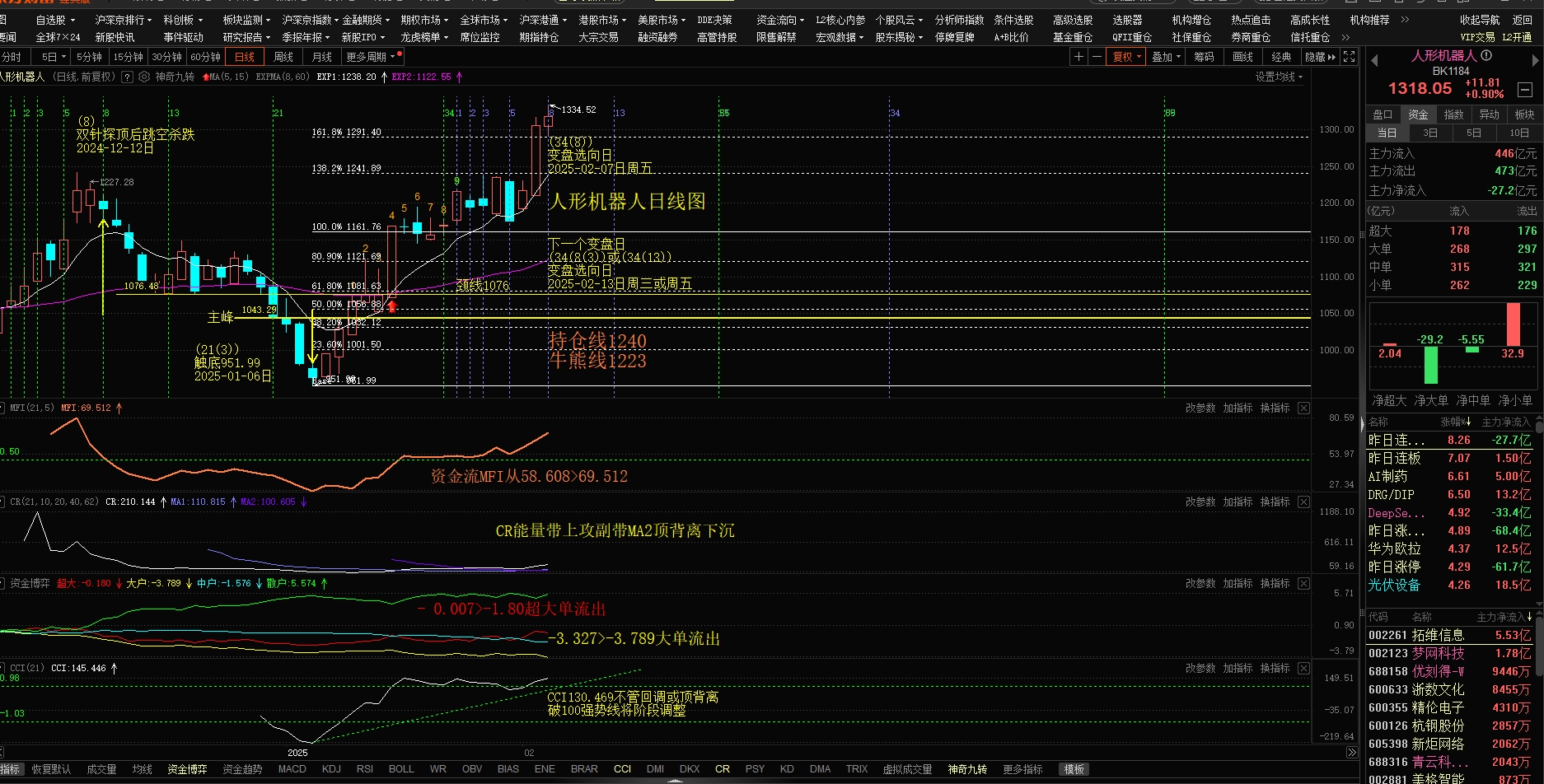人形机器人上周收1318.05,30分钟技术指标都是顶背离,今天会不会市场消息: