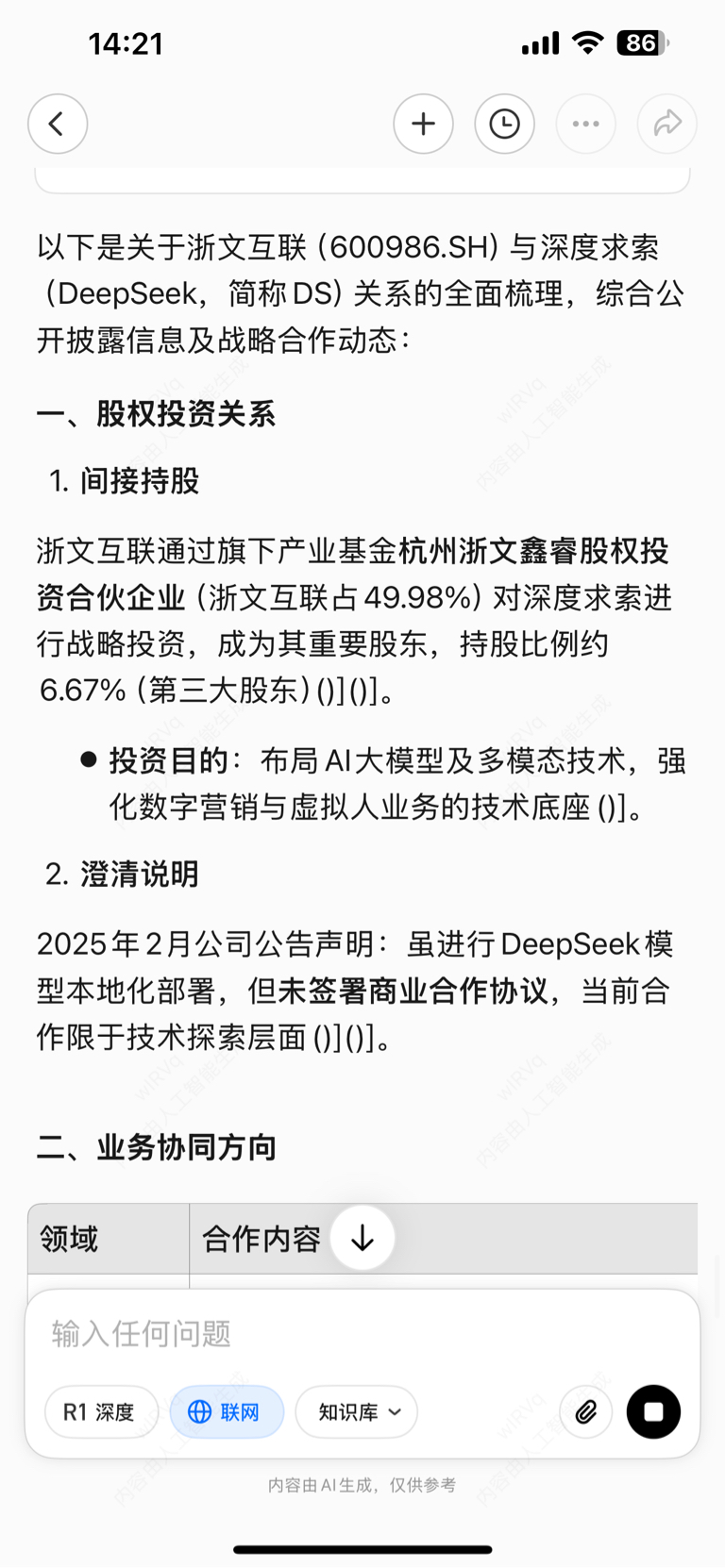 $浙文互联(SH600986)$ 有多少人是认为他和深度求索有关系才埋进来的,我就是!实际上后面仔细研究DS股权结构,发现毫无关系,业务上也没有真凭实据!!DS幻觉很多,很会骗人呀