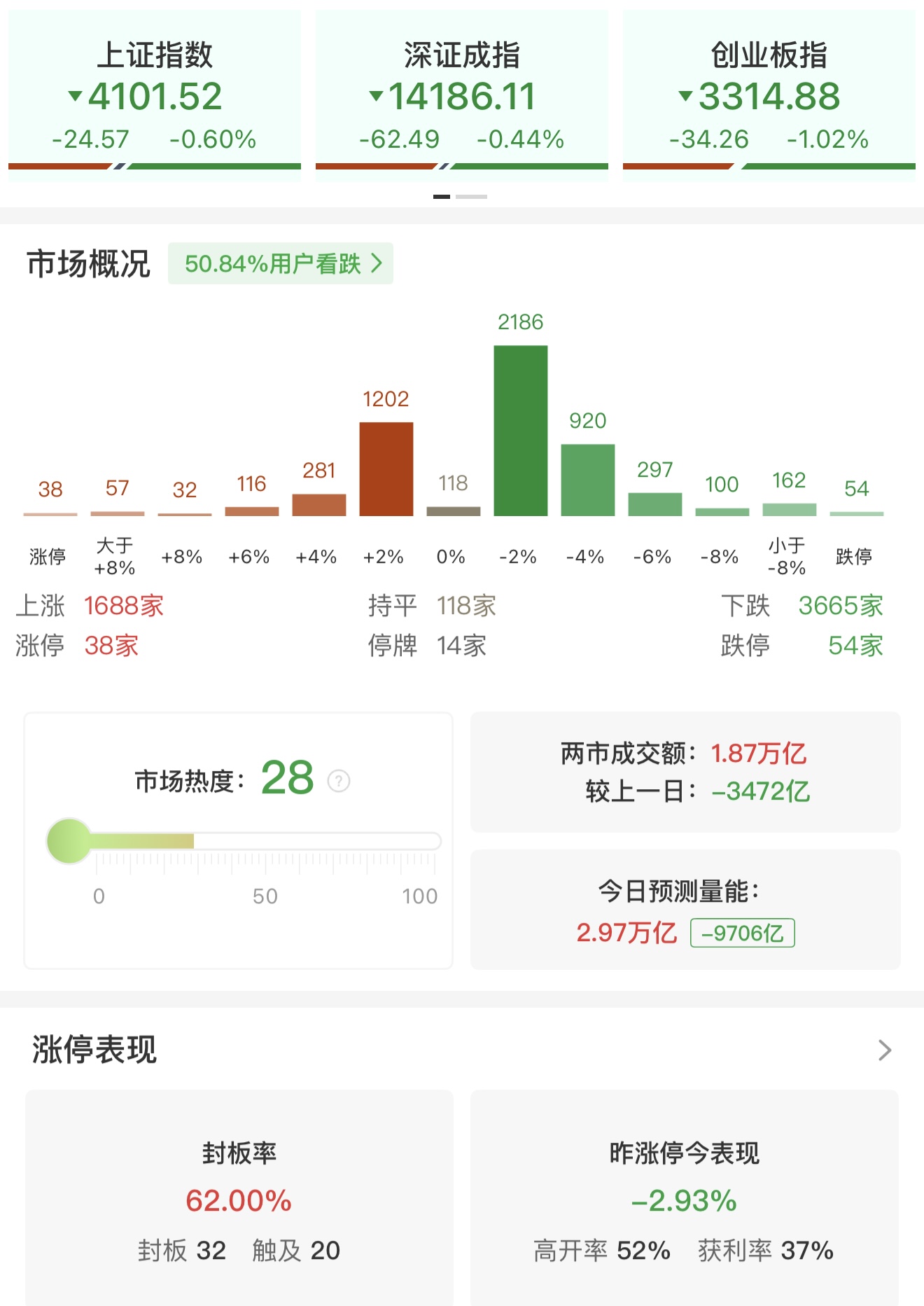 财联社1月15日电,市场早盘冲高回落,创业板指跌超1%,科创50指数盘中跌超2%。沪深两市半日成交额1.87万亿,较上个交易日缩量3472亿。盘面上热点较为杂乱,全市场超3600只个股下跌。从板块来看,旅游酒店板块表现活跃,众信旅游2连板,陕西旅游涨停。有色金属板块走高,四川黄金、罗平锌电涨停。商业零售概念局部拉升,新华百货、新华都双双2连板。下跌方面,商业航天、AI应用方向大跌,高位人气股集体退潮,省广集团、浙文互联、银河电子、金风科技、鲁信创投、杭萧钢构、航天电子等多股跌停。截至收盘,沪指跌0.6%,深成指跌0.44%,创业板指跌1.02%。