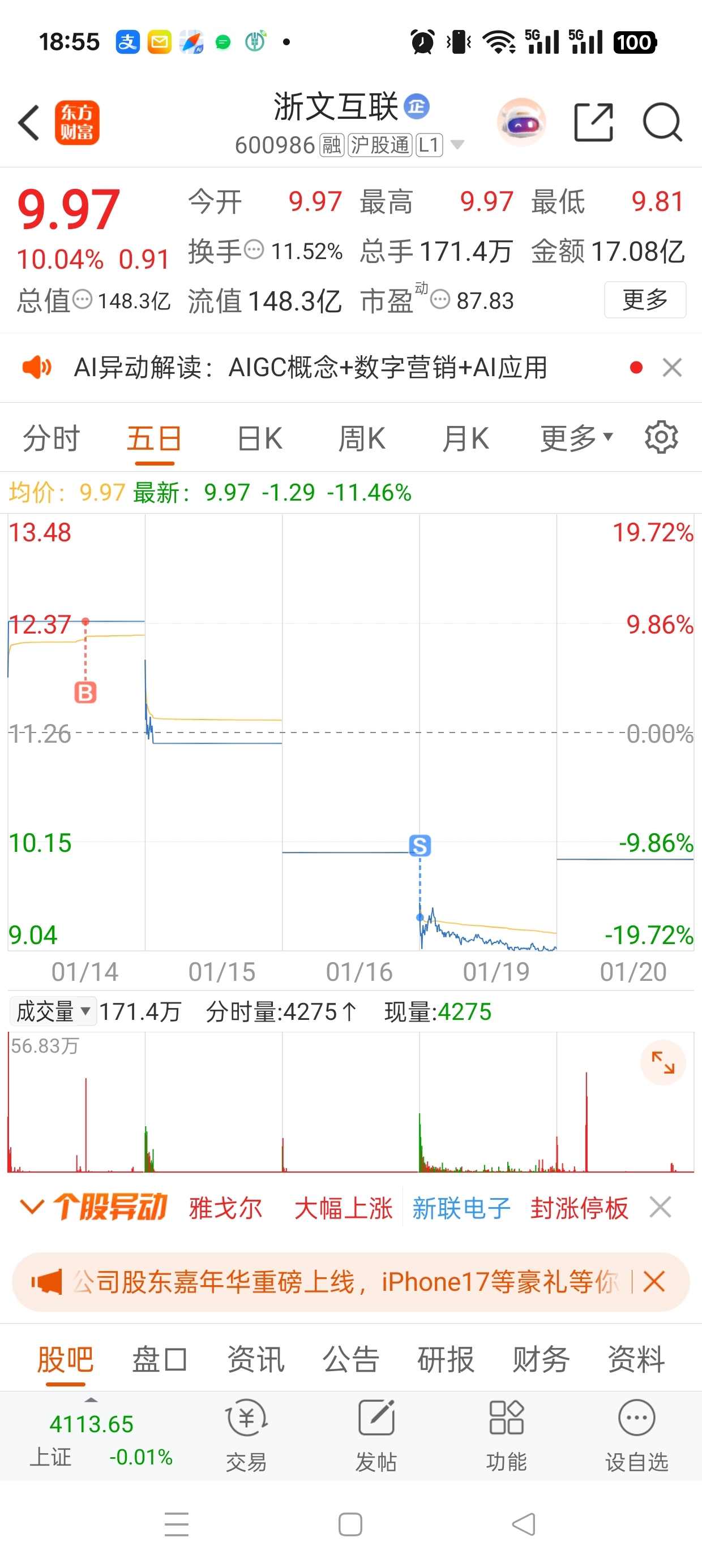 $浙文互联(SH600986)$ 老子昨天刚割肉,今天一字涨停,什么情况?什么事件刺激啊