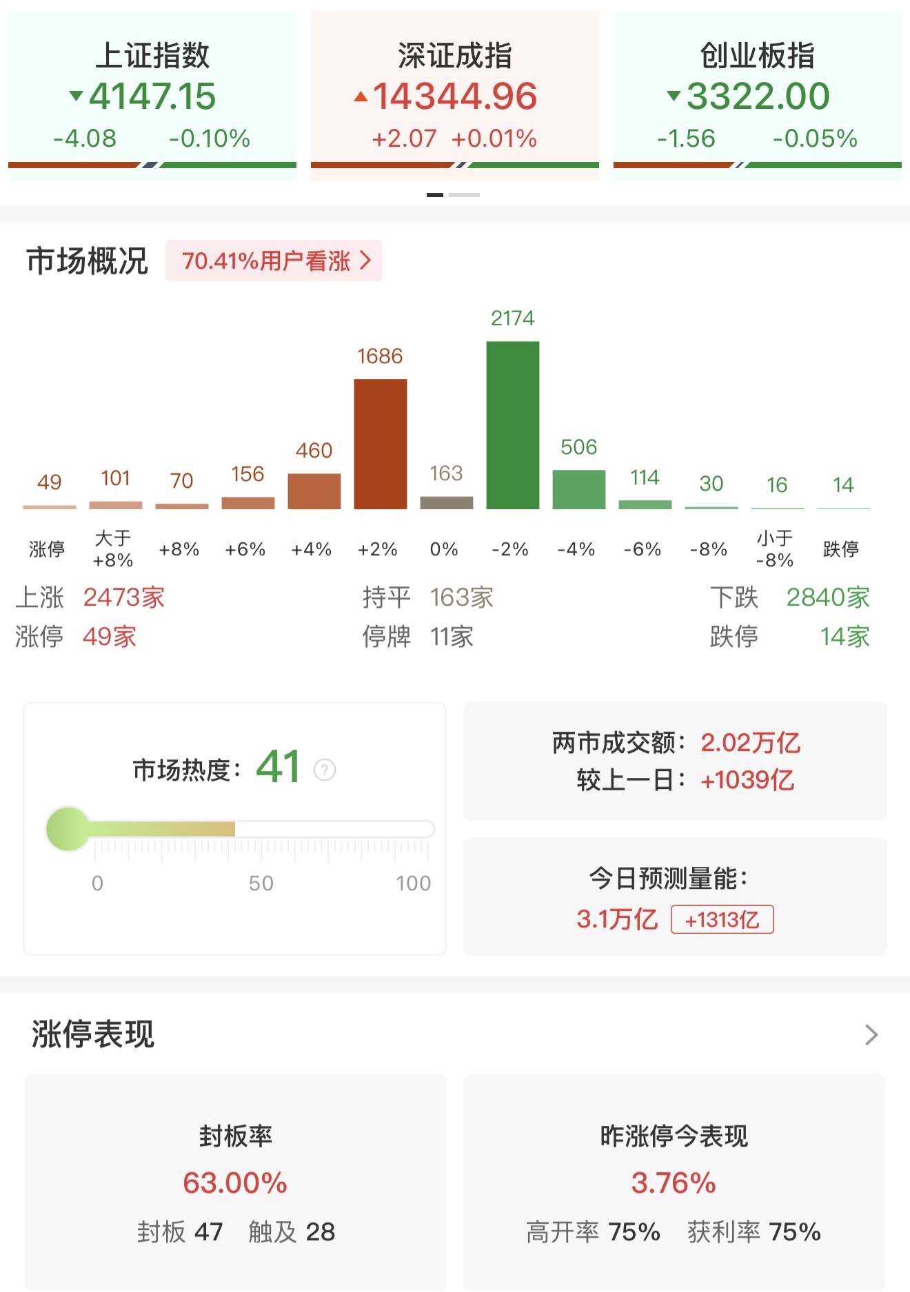 财联社1月29日电,三大指数盘中集体翻绿,沪指窄幅震荡,创业板指冲高回落,科创50指数跌超1%。沪深两市半日成交额2.02万亿,较上个交易日放量1039亿。盘面上热点快速轮动,全市场超2800只个股下跌。从板块来看,贵金属概念反复活跃,西部黄金7天4板,中国黄金5连板,湖南黄金4连板。油气股延续强势,通源石油涨超10%。AI应用概念表现活跃,浙文互联8天4板,因赛集团、粤传媒涨停。银行板块持续走高,青岛银行涨停。房地产板块震荡反弹,大悦城、三湘印象、我爱我家涨停。下跌方面,半导体产业链走势较弱,北京君正、神工股份跌超6%。截至收盘,沪指跌0.1%,深成指涨0.01%,创业板指跌0.05%。