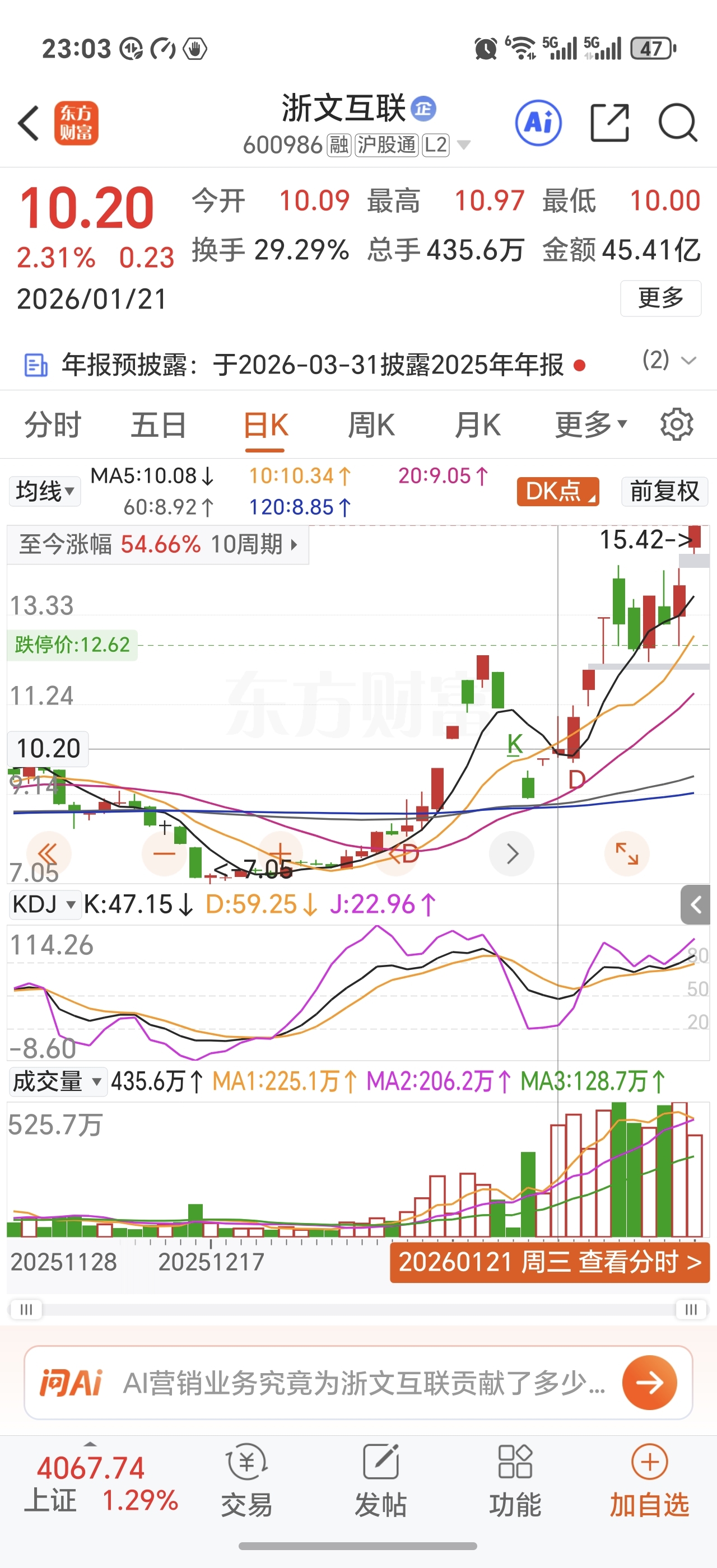 $浙文互联(SH600986)$ 唉,看来技术分析对于大A没用。原本打算当天买入的,一个上影线把我吓跑了