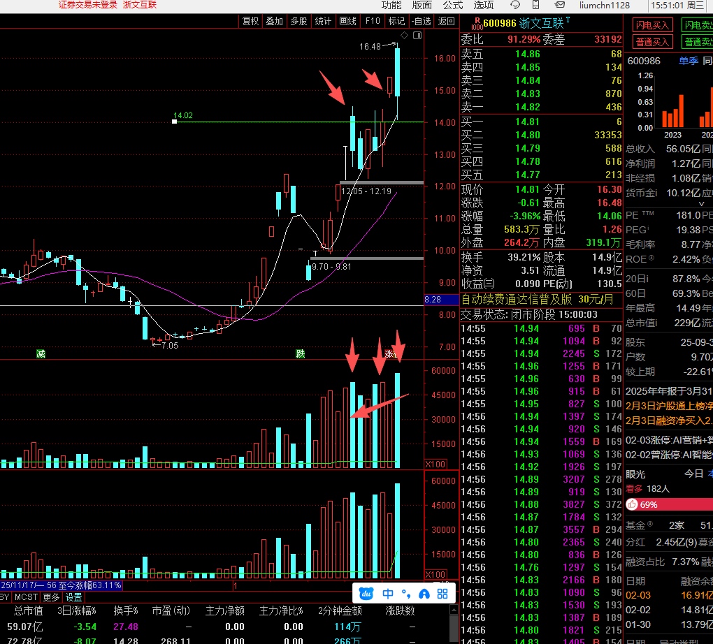 $浙文互联(SH600986)$ 这个浙文互联,27号放量阴线,昨日平量反包未放量,今天放量砸回,这不是正常逻辑吗!今天如果是缩量反而不能进! 唯一不足的就是尾盘拉回一点空间,给明日洗盘创造了充足的空间了