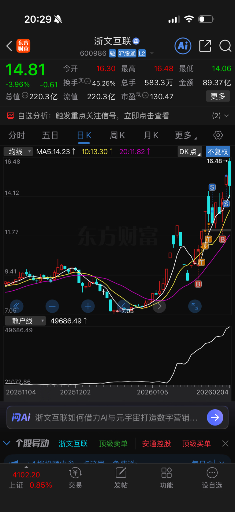$浙文互联(SH600986)$ 当股吧里多了,就可以走了。前天入了双良和浙文,双良继续格局爽吃两板,浙文昨天板上交易200w手,这根本玩不下去,风险太大我也板上走了,今天果然不出所料。明天也不是入场机会,后天看看吧