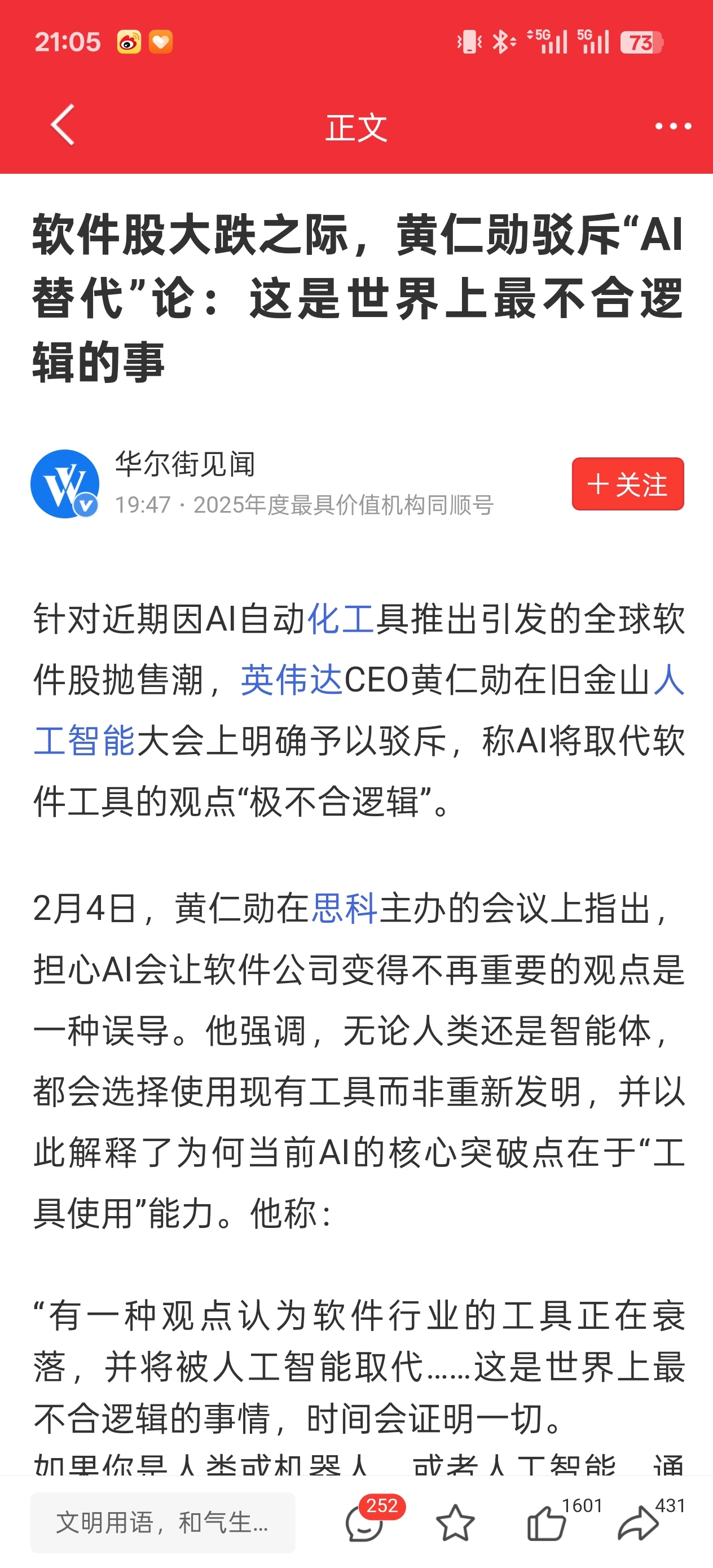 黄仁勋再次明确驳斥了AI将简单取代现有软件工具的流行观点,称其“极不合逻辑”。他