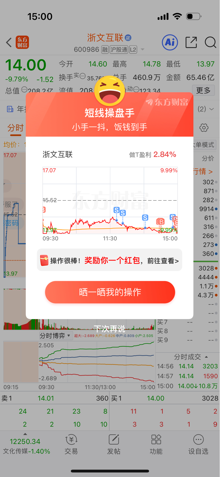 $浙文互联(SH600986)$ 还是那句话,开盘50万手跌停都摁不死,龙头就是强,不看好就走,看好就留下,龙头随时给你体面的离开不会埋你,本来下午开盘还是缩量打算走的,尾盘去摸跌停板那十分钟突然爆量了,所以打算再追回来博弈周末有没有什么消息,昨晚我确实唱多年前看到30块,今天也让我失去了信心,但是悲观状态下整个市场也没有什么主线,ai应用怎么看也已经到底部了,周一如果不收回5日线我也会走
