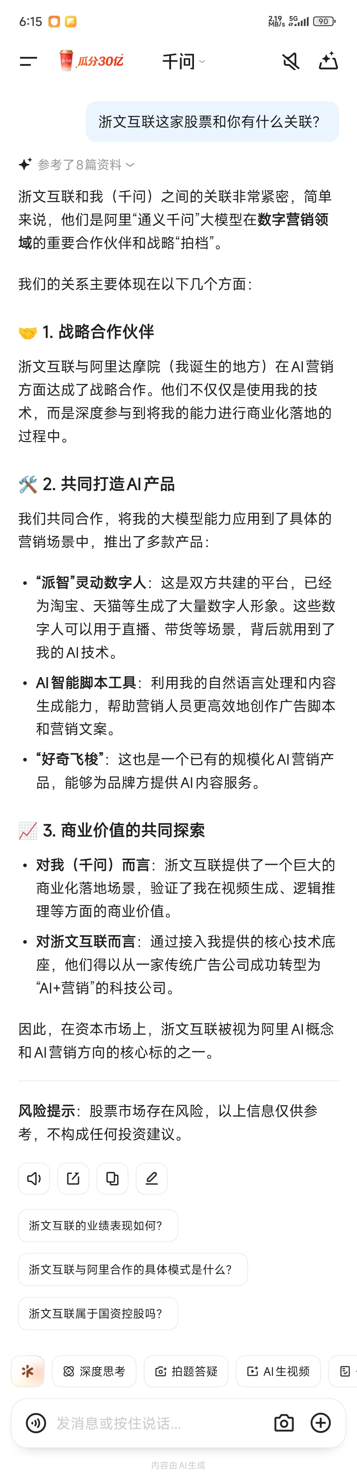 $浙文互联(SH600986)$ #千问app挤崩服务器!阿里打响AI普及战# $阿里巴巴-W(HK|09988)$ 千问给我的答复是这样的