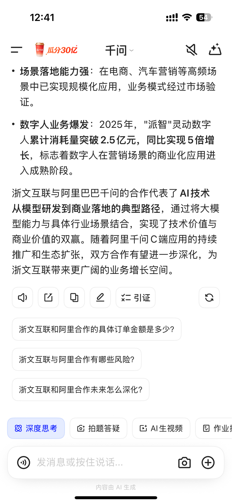 $浙文互联(SH600986)$ 浙文互联与阿里巴巴建立了深度、多维度的战略合作关系,双方在AI内容生成、算力基础设施、数字营销等领域实现了深度融合,形成了"内容+算力"双轮驱动的业务模式。一、核心合作领域1. AI内容生成与AIGC应用- "好奇飞梭"平台合作:浙文互联将阿里通义万相2.1模型接入其自研的"AIGC超级内容工厂"——"好奇飞梭"平台,实现了"输入文案-生成视频"的全流程自动化,单条广告视频制作周期从3天缩短至5分钟,成本降低90%。- "派智"数字人平台:双方共建"派智"灵动数字人平台,已为淘宝、天猫等阿里系客户累计生成65款数字人形象,2024年前11个月商业化消耗超5000万元,单条视频峰值消耗突破200万元。- AI智能脚本工具:与阿里妈妈共建的AI智能脚本工具,在服饰、家电等品类实现广告点击率提升120%,素材生产效率提升300%。2. 算力基础设施合作- 浙文智算平台:浙文互联旗下"浙文智算"成为阿里重要合作伙伴,为阿里数据中心提供算力调度、存储优化等增值服务,并参与阿里云百炼大模型平台的算力租赁业务。- 业务增长显著:2025年一季度,浙文智算与阿里相关的订单金额同比增长180%。- 零碳算力探索:双方在"零碳算力"领域展开合作,依托浙江能耗指标政策优势,共建绿色数据中心,目标将算力运营成本降低30%。3. 营销与商业变现- 数字营销核心业务:浙文互联以数字营销为核心业务,约占营收80%,覆盖品牌营销、效果营销两大板块。- 客户资源:服务包括长安汽车、比亚迪等头部车企及腾讯、字节跳动等互联网平台,在汽车营销细分领域服务全国超75%的头部汽车品牌,市场份额约15%,稳居行业前三。- 阿里生态整合:作为阿里生态合作伙伴,浙文互联为阿里系商家提供低成本、高适配的AI营销解决方案。二、合作背景与战略意义1. 阿里AI战略转型- 2025年11月17日,阿里巴巴宣布基于Qwen大模型的"千问"APP公测上线,标志着其AI战略从B端企业服务向C端个人用户市场的重要转变。- 阿里千问App公测一周内下载量突破1000万次,超越ChatGPT、Sora、DeepSeek成为史上增长最快的AI应用。- 2025年4月29日,阿里巴巴正式发布新一代通义千问模型Qwen3,并以Apache 2.0协议开源全系列8款模型,覆盖从0.6B到235B参数量级。2. 产业链协同效应- 浙文互联通过"数字营销+算力基建+AI技术"的三维布局,从传统广告公司转型为数字文化科技主平台。- 阿里方面宣布未来三年将投入超3800亿元建设云和AI硬件基础设施,为浙文互联等合作伙伴提供了广阔的发展空间。三、市场反应与业务成果1. 资本市场反应- 2025年4月29日,阿里巴巴发布新一代通义千问模型Qwen3后,浙文互联等AI智能体概念股在4月30日集体涨停,涨停价8.02元/股,市盈率27.11,总市值119.3亿。- 2026年1月20日,AI应用概念持续走高,浙文互联10%涨停,普元信息、蓝色光标等涨幅居前,市场对AI应用概念的认可度持续提升。2. 业务协同优势- 内容+算力双受益:浙文互联既帮助阿里降低内容制作成本,又获取算力调度订单,形成双向业务协同。- 场景落地能力强:在电商、汽车营销等高频场景中已实现规模化应用,业务模式经过市场验证。- 数字人业务爆发:2025年,"派智"灵动数字人累计消耗量突破2.5亿元,同比实现5倍增长,标志着数字人在营销场景的商业化应用进入成熟阶段。浙文互联与阿里巴巴千问的合作代表了AI技术从模型研发到商业落地的典型路径,通过将大模型能力与具体行业场景结合,实现了技术价值与商业价值的双赢。随着阿里千问C端应用的持续推广和生态扩张,双方合作有望进一步深化,为浙文互联带来更广阔的业务增长空间。