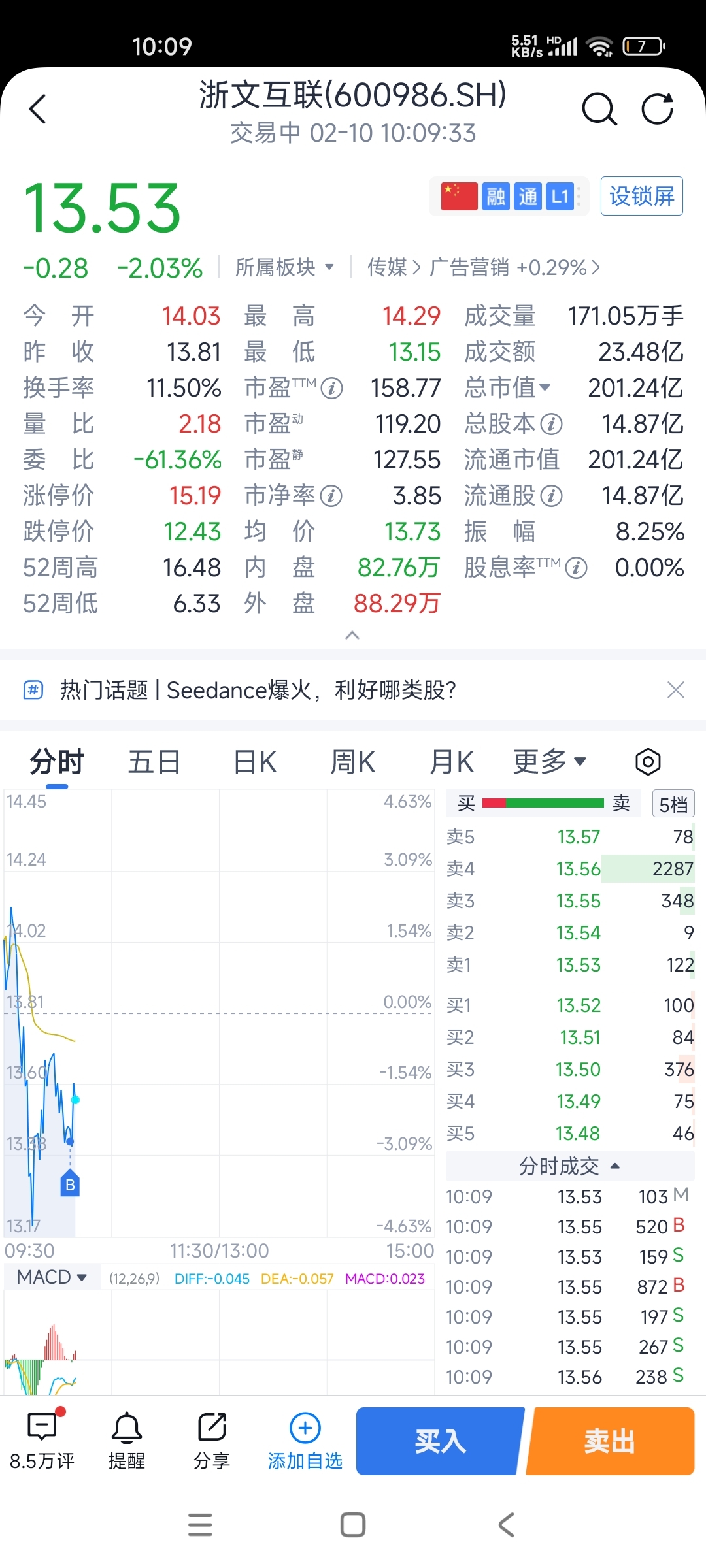 $浙文互联(SH600986)$ 洗盘,绝对是洗盘,不管了,13.4果断插入。